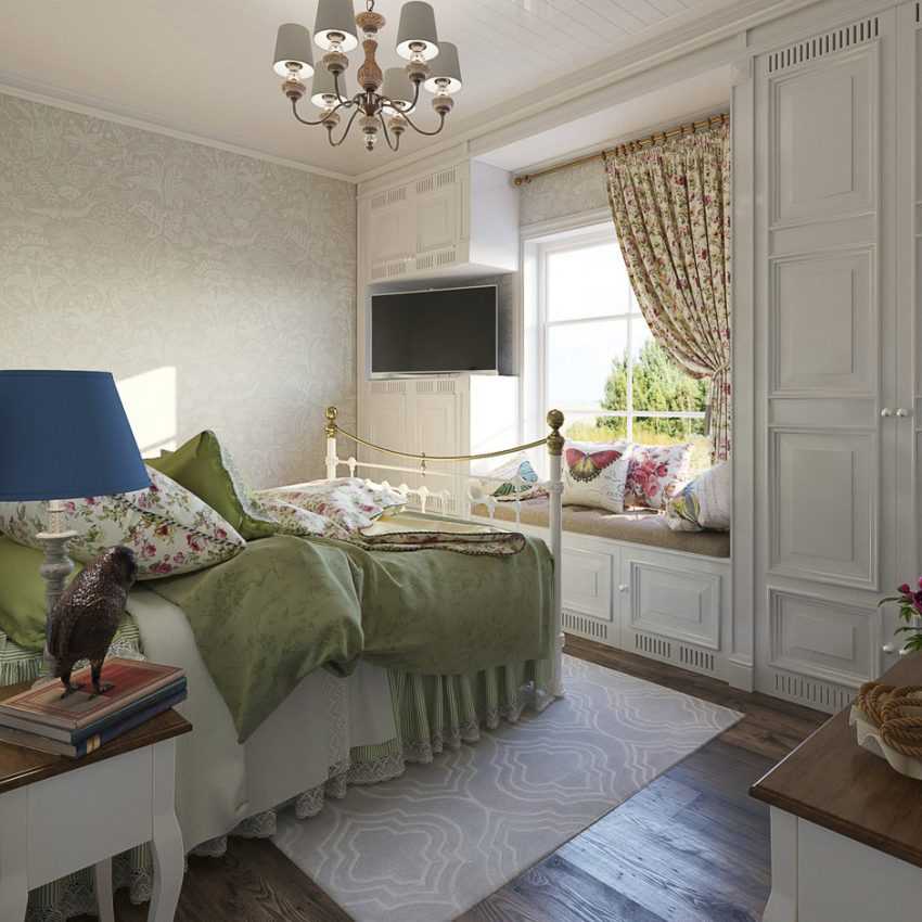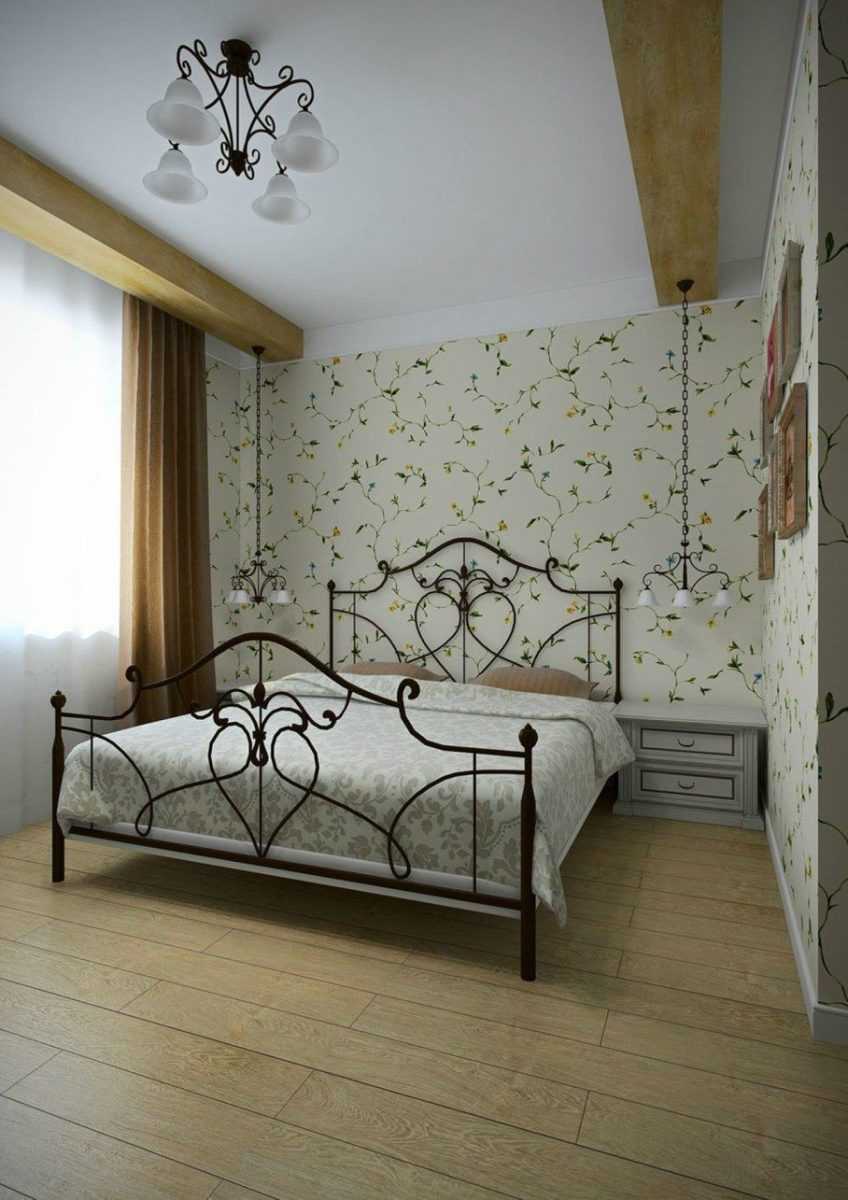 Спальни в хрущевке маленькие, и оформление их в стиле прованс нужно тщательно продумать. Стены можно оклеить обоями с изображением цветов, листьев. Если комната узкая, их лучше просто побелить. Это позволит визуально расширить пространство.