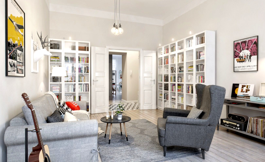 Так как скандинавский стиль не предполагает наличие помещений большой площади, он идеально подойдёт для оформления помещений в стандартных малогабаритных квартирах. При этом некоторые нюансы их архитектуры и дизайна вполне подойдут для того, чтобы быть использованными для оформления гостиной в описываемом стиле. Например, к ним можно отнести элементы кирпичной кладки или фрагменты бетонной плиты, окрашенные в белый цвет.