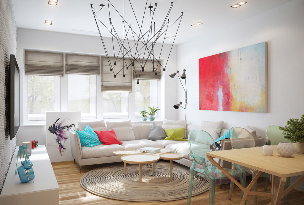 Не следует создавать однотонный дизайн, даже любимая всеми белизна может вызывать ассоциации больничной палаты со своей стерильностью и чистотой. Оживить смогут красивые яркие подушки на диване, коврики, картинки, светильники, горшки с цветами.