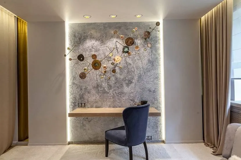 - Декоративная штукатурка. С ее помощью на поверхности ниши можно формировать любую структуру и рельеф. Материал имеет огромное количество разновидностей и годится для дизайна ниши в стене комнаты любого назначения.