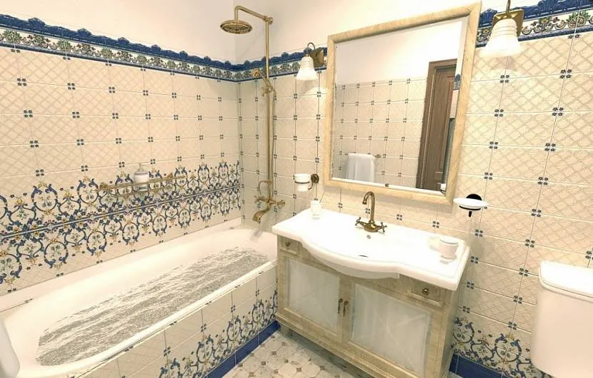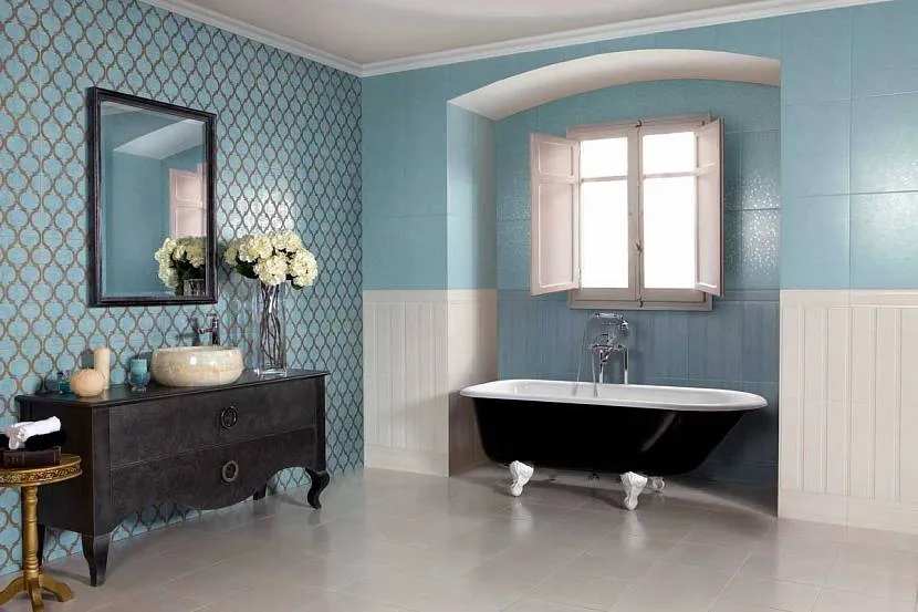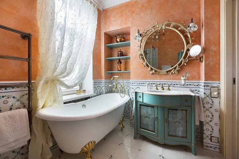 Ванна, раковина, биде, унитаз должны быть классическими, лучше всего — овальными. Никаких прямых углов, обязательно наличие бортиков. Чем более традиционна форма — тем лучше. Чаша ванной может стоять обособленно, на красивых ножках, отлитых из чугуна. Кроме эмалированных, этот стиль признает также ванны из камня и дерева — это наиболее дорогой, но и наиболее эффектный вариант.
