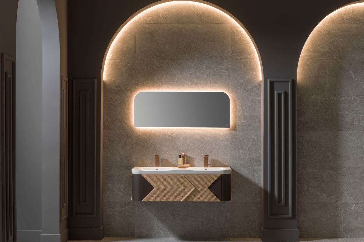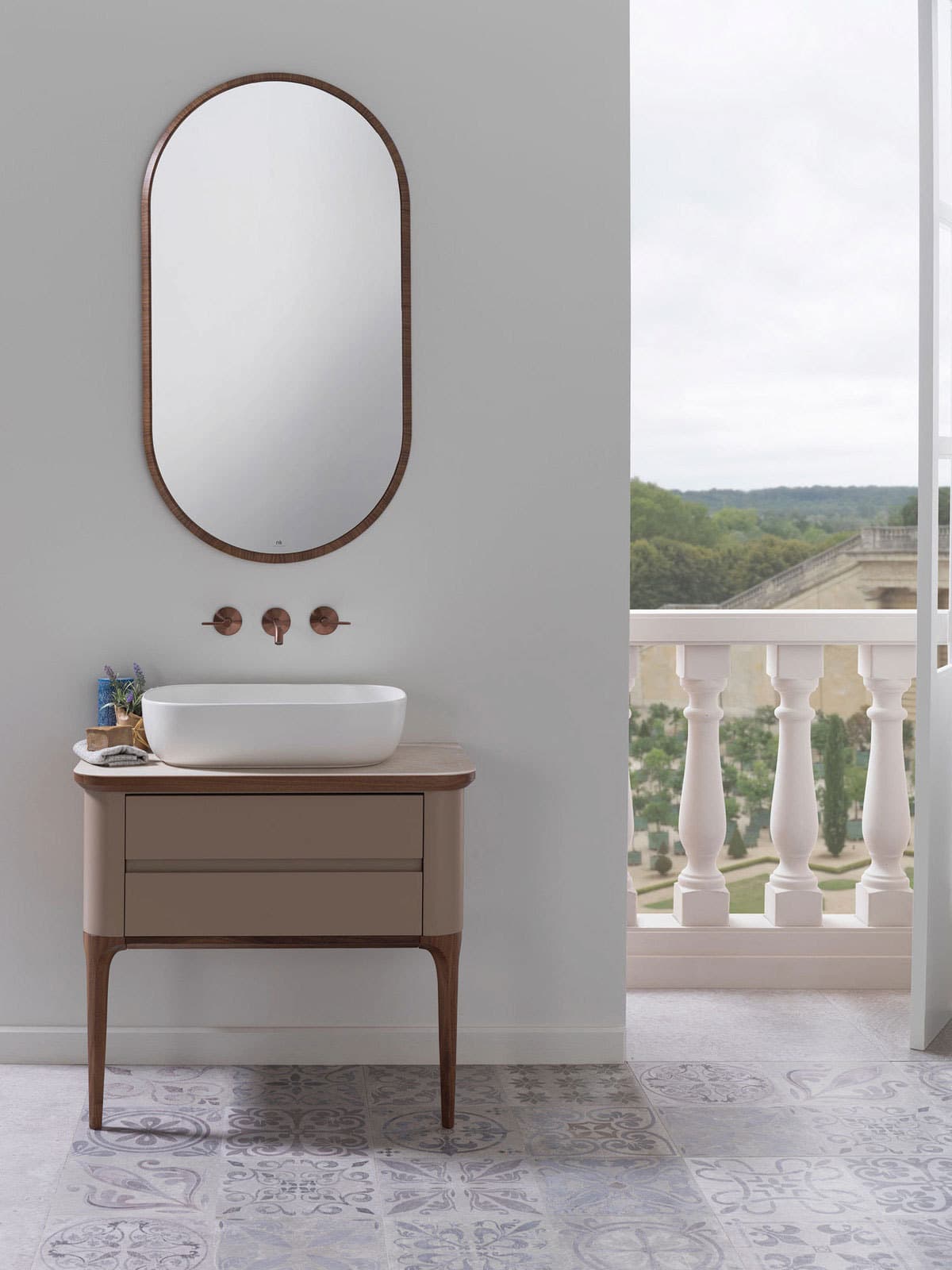 Идеальным вариантом является мебель Liem в своей компактной версии 82 см и 122 см. Она изготовлена из массива натурального орехового дерева и доступна как в подвесном варианте, так и на ножках, которые позволяют ей лучше вписаться в стиль рустик ванных комнат. Ее продуманный дизайн с лепниной шлифованных и закругленных форм обладает такими техническими характеристиками, как долговечность и простота обслуживания благодаря столешнице из керамогранита.