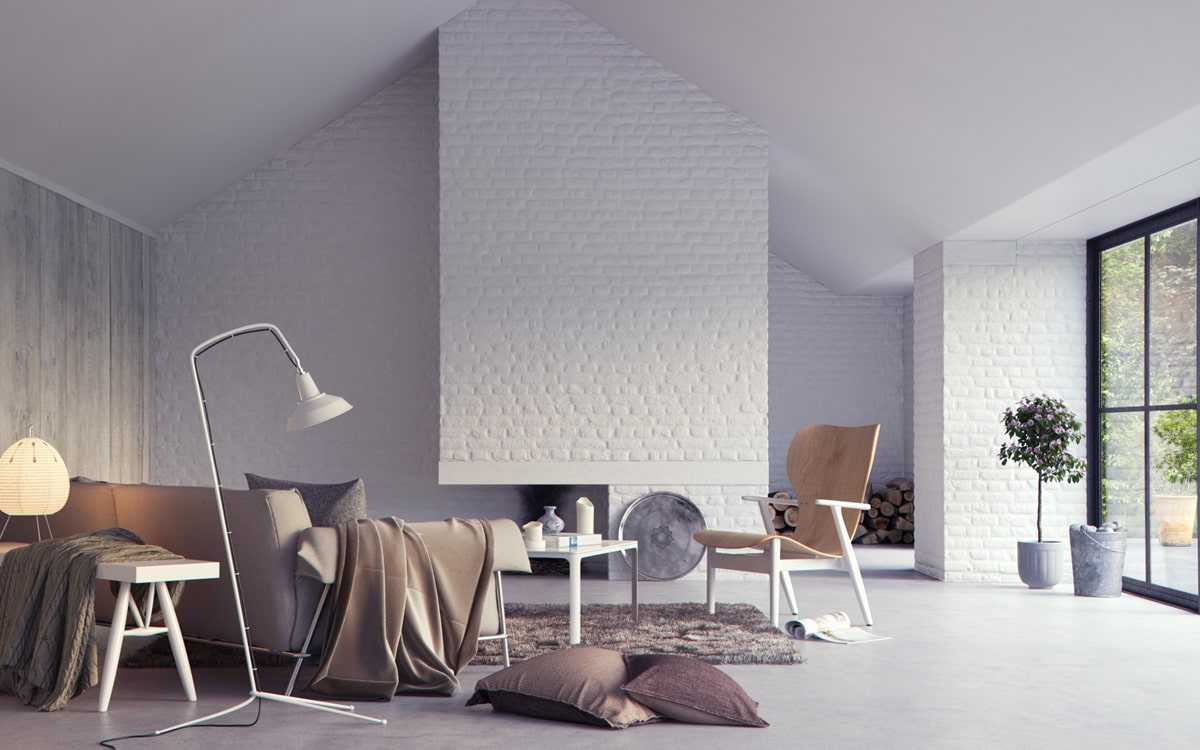 В скандинавском стиле дизайна помещения обязательным условием является окрашивание всех фактурных элементов, поэтому вся комната, вместе с кладкой, приобретает один тон, преимущественно белый.