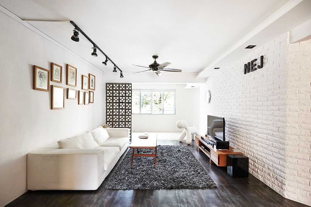 Если идея дизайна гостиной с кирпичной стеной состояла не в акцентировании на нее, а в создании фонового элемента декора, то кладку красят в один тон со всеми стенами в комнате.