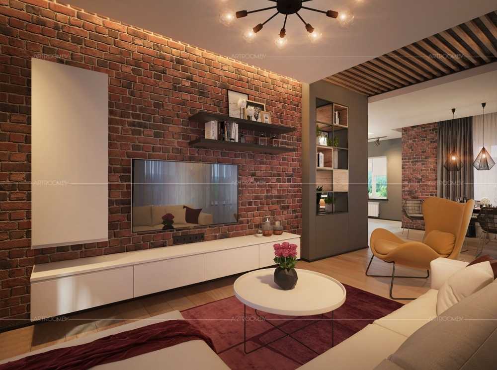 Стена из кирпича в гостинном интерьере комнаты смотрится модно, важно и стильно. Такое решение добавляет помещению особенный стиль и характер