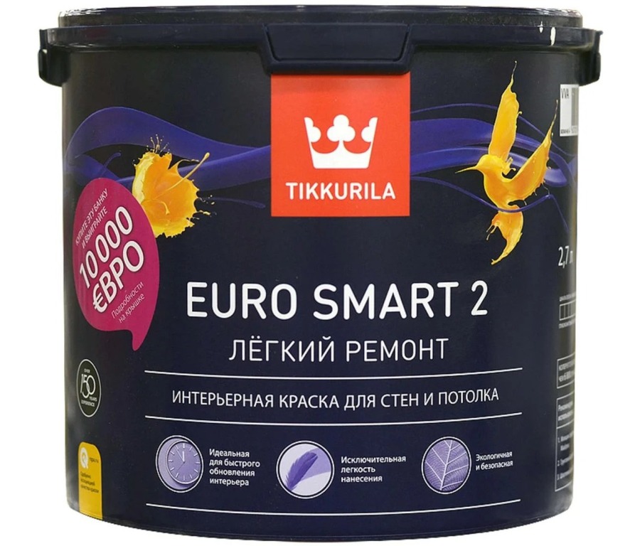Водоразбавляемая краска для стен и потолков «Tikkurila Prof Euro 7» рекомендована в помещения с нормальной и повышенной влажностью. Она легко наносится и долго держится на поверхностях из таких материалов, как гипсокартон, кирпич, бетон, штукатурка, древесноволокнистые плиты и др.
