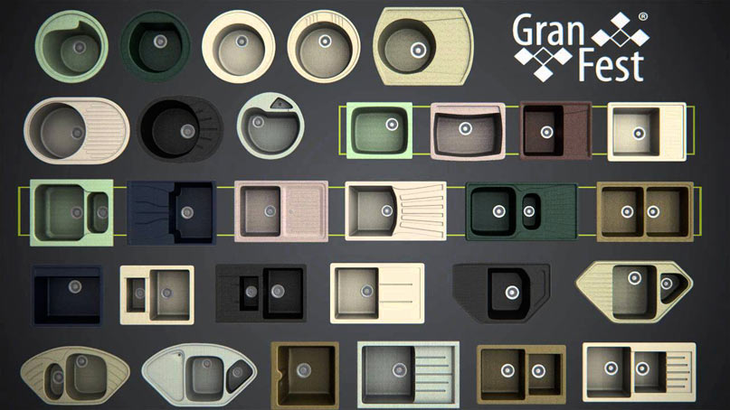 Мойки GranFest изготавливают из мраморной крошки и полимерного соединителя. Производитель утверждает, что срок службы изделий достаточно велик. Также они отличаются высокой прочностью и гладкостью поверхности. GranFest представляет широкий модельный ряд моек. Среди них есть следующий формы: