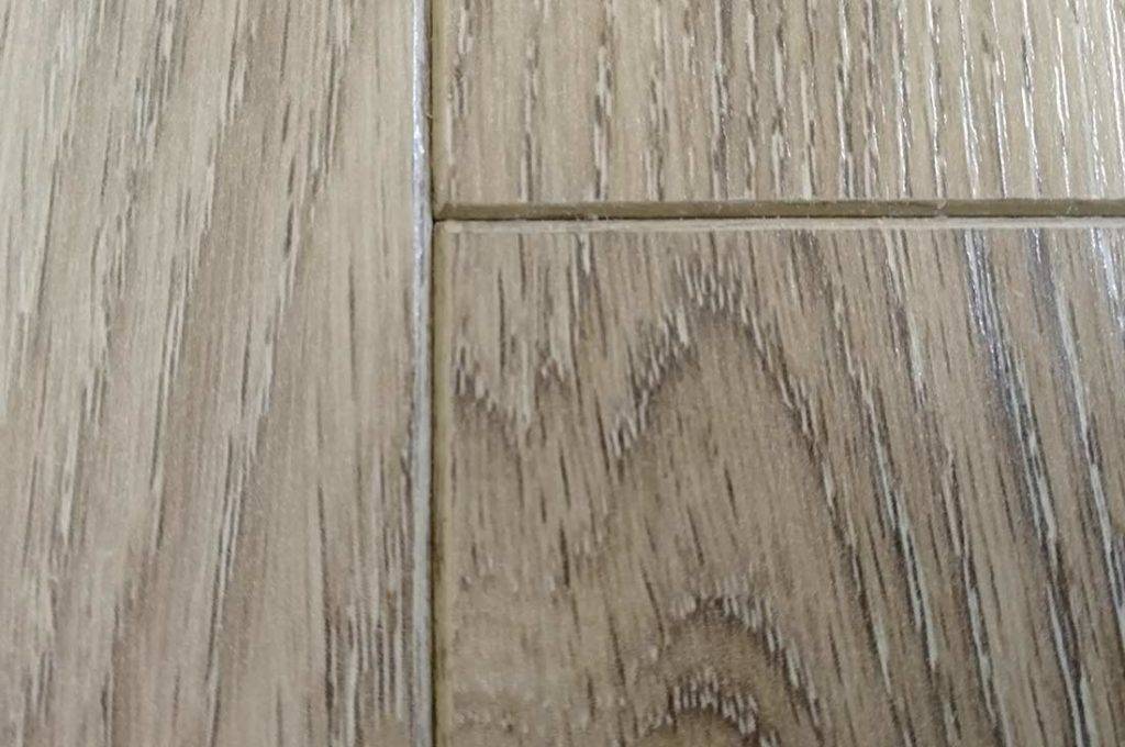 В общем, как вы поняли, собирать ламинат Floorwood Serious легко. Подбивать практически нет необходимости, так как панели за счет широкой площадки, смазки водоотталкивающим составом и значительно веса отлично ложатся в горизонтальное положение. Однако при сборке между фасками есть небольшой зазор. Связываю это с грубоватым исполнением фаски – она достаточно неровная. Хотя внешне выглядит интересно: цвет фаски совпадает с тональностью и фактурой самого покрытия. Из чего можно сделать вывод, что фасочная грань ламинированная. Однако стойкость фаски на физические нагрузки слабовата. Удалось какой-то фрагмент снять ногтем пальца руки.