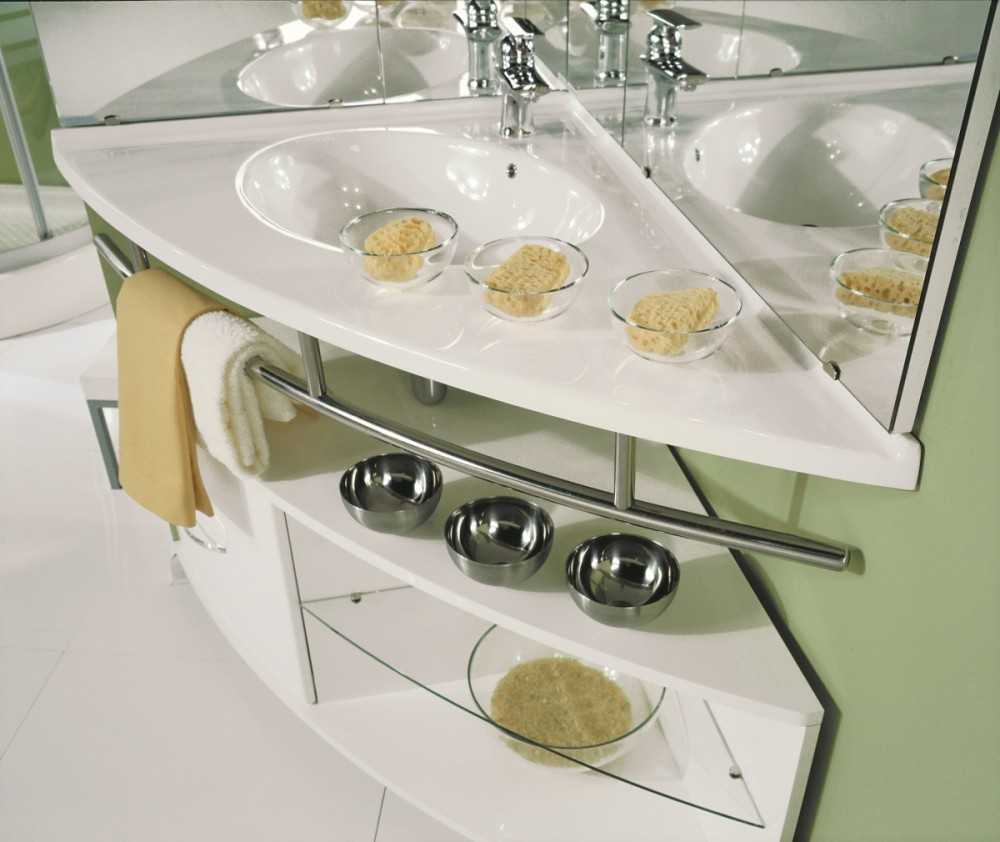 Один из вариантов грамотного использования площади в маленьком помещении – угловые тумбы с раковинами, стеллажи или полки. Компания Акватон производит угловую мебель для ванной различных размеров и конфигураций, например, модели «Караван», «Консул» или «Корнер».