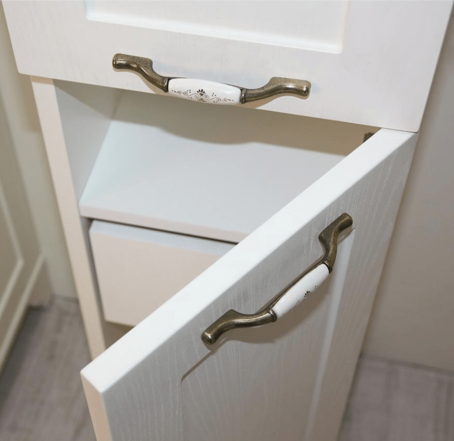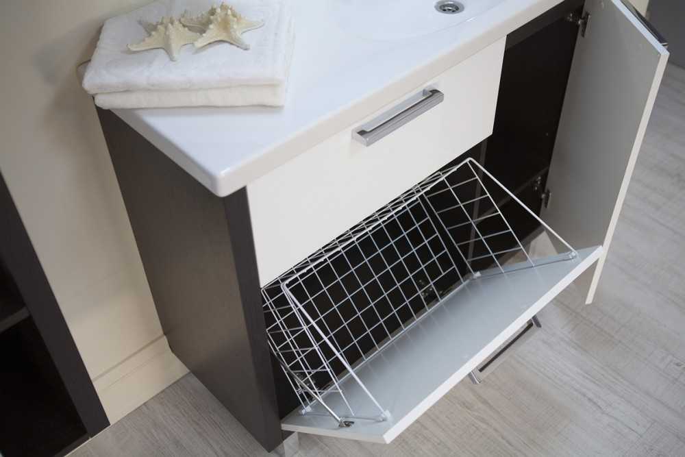 Комод под раковину не только скроет запасы моющих средств, он замаскирует водопроводные трубы. Не придется прятать их за панелями или с помощью других средств. При необходимости получить доступ к разводке очень просто — достаточно вынуть из шкафа все полки. Также в тумбу можно поставить стиральную машинку или корзину для белья.