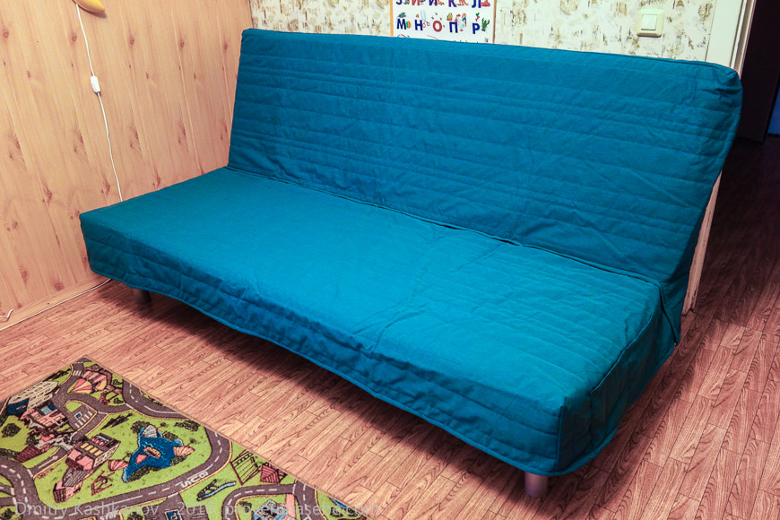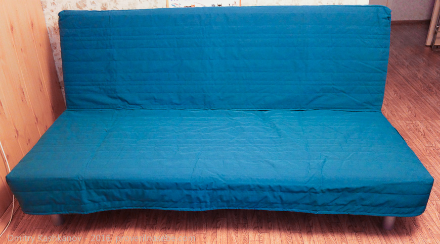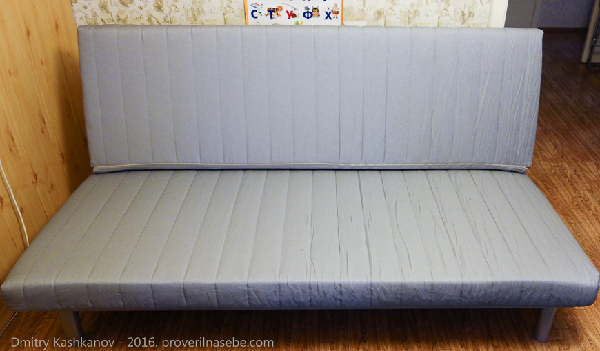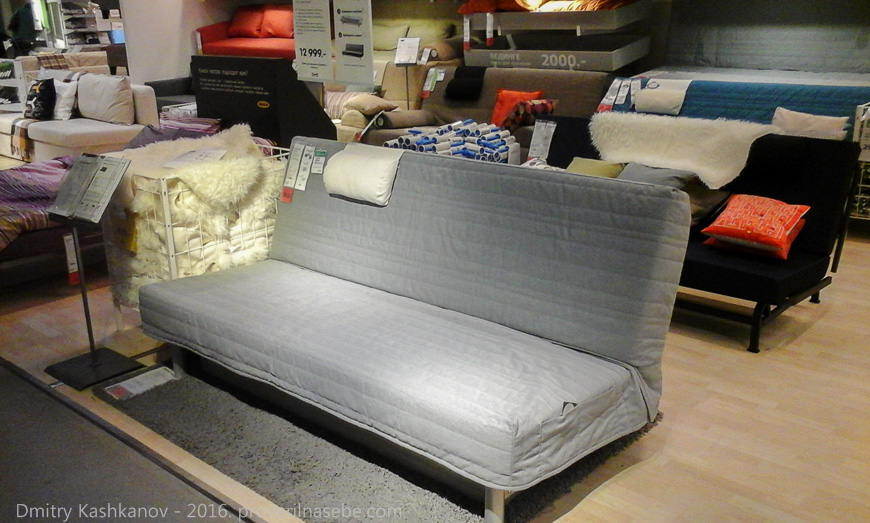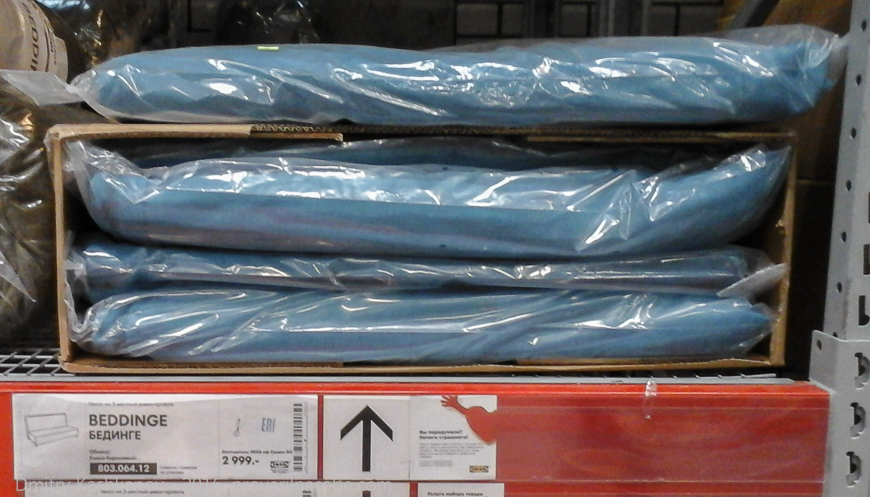 Одним словом, если бы я был каким-нибудь Рокфеллером и вдруг по какой-то необъяснимой прихоти решил купить диван Бединге в ИКЕА, то самый дорогой комплект разорил бы меня на 24000 руб. Мой реальный набор выглядит скромнее — 14000 рублей (без каких-то копеек). Со временем надо еще купить ящик для постельных принадлежностей. Он продается отдельно и стоит 2000 р.
