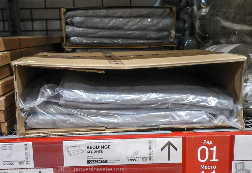 В отделе диванов мне сразу бросился в глаза вот этот вариант. Диван Бединге (Beddinge). Недорогой, мягкий, не скрипучий и очень удобный для транспортировки. За качество снимков прошу прощения — снимал телефоном: