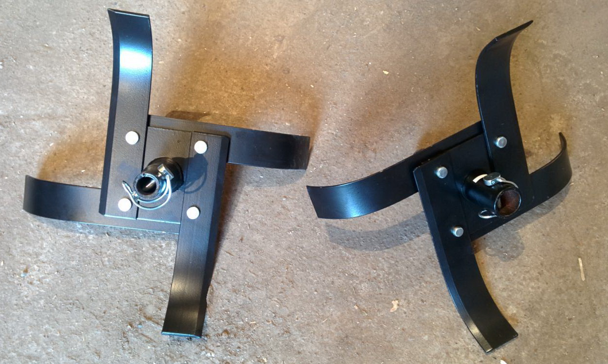 Замечание!Машиной, оборудованной фрезой третьего типа, обрабатывают почву любого типа на глубину 25 см. Конструкция навески «гусиные лапки» неразборная, поэтому количество секций подбирают в соответствии с техническими характеристиками мотоблока.