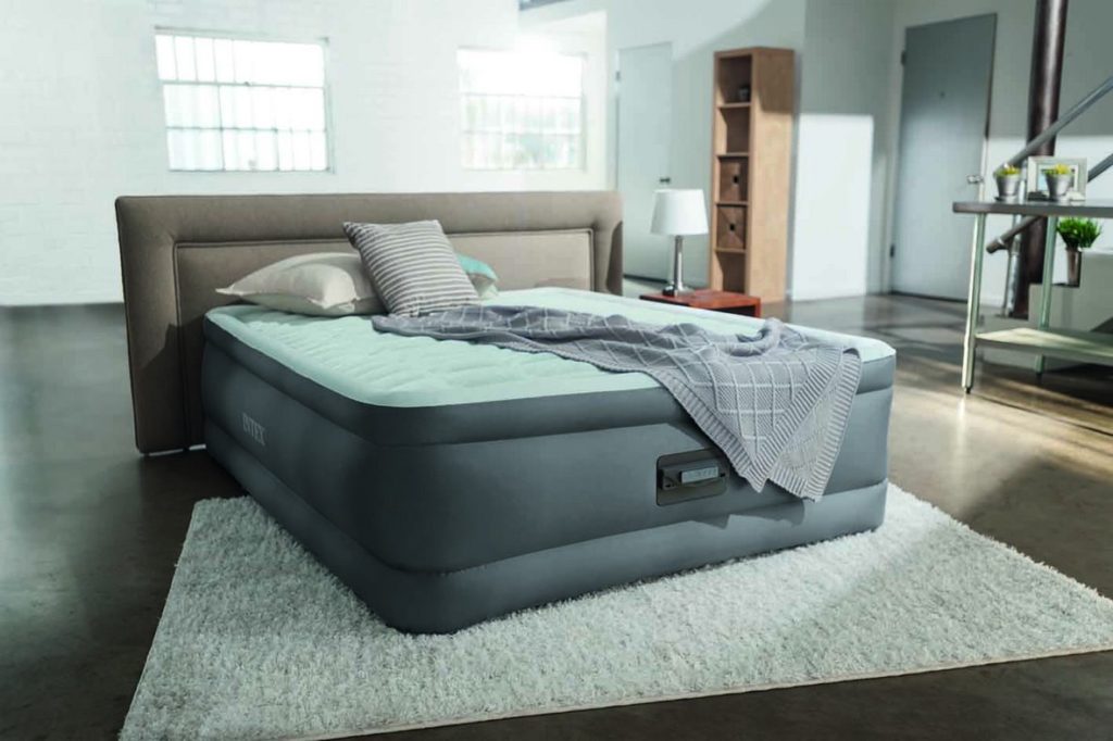 - Интекс Комфорт Плюш. Занял первое место. Имеет встроенный насос, флокированную или виниловую поверхность, поперечную раму. Есть полуторная и двуспальная модификации. Выдерживает нагрузку до 273 кг. В комплект входит ремкомплект, сумка для хранения и транспортировки. Стоимость 4000 руб.
