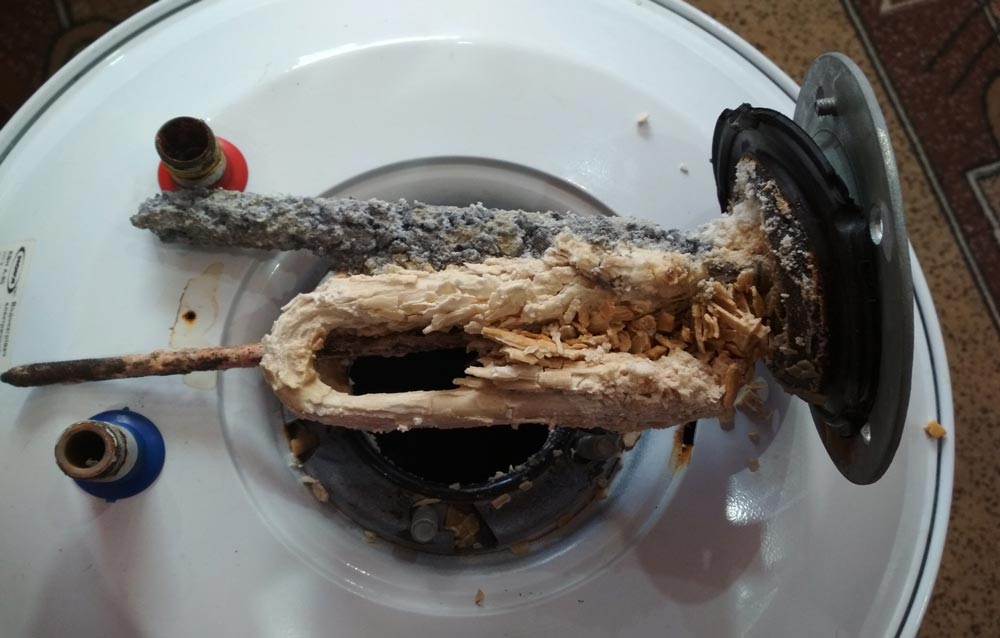 Вытаскиваем старый ТЭН. Как видите, оболочка просто открылась по шву, это происходит из-за обильного слоя корки, в результате чего образуется недостаточный теплоотвод, последующий перегрев и разрушение