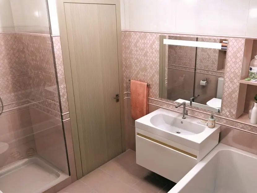 - Для небольшого помещения стоит использовать плитку небольшого размера или светлую мозаику с мелким принтом. Такой вариант позволит сделать помещение визуально шире и просторнее.