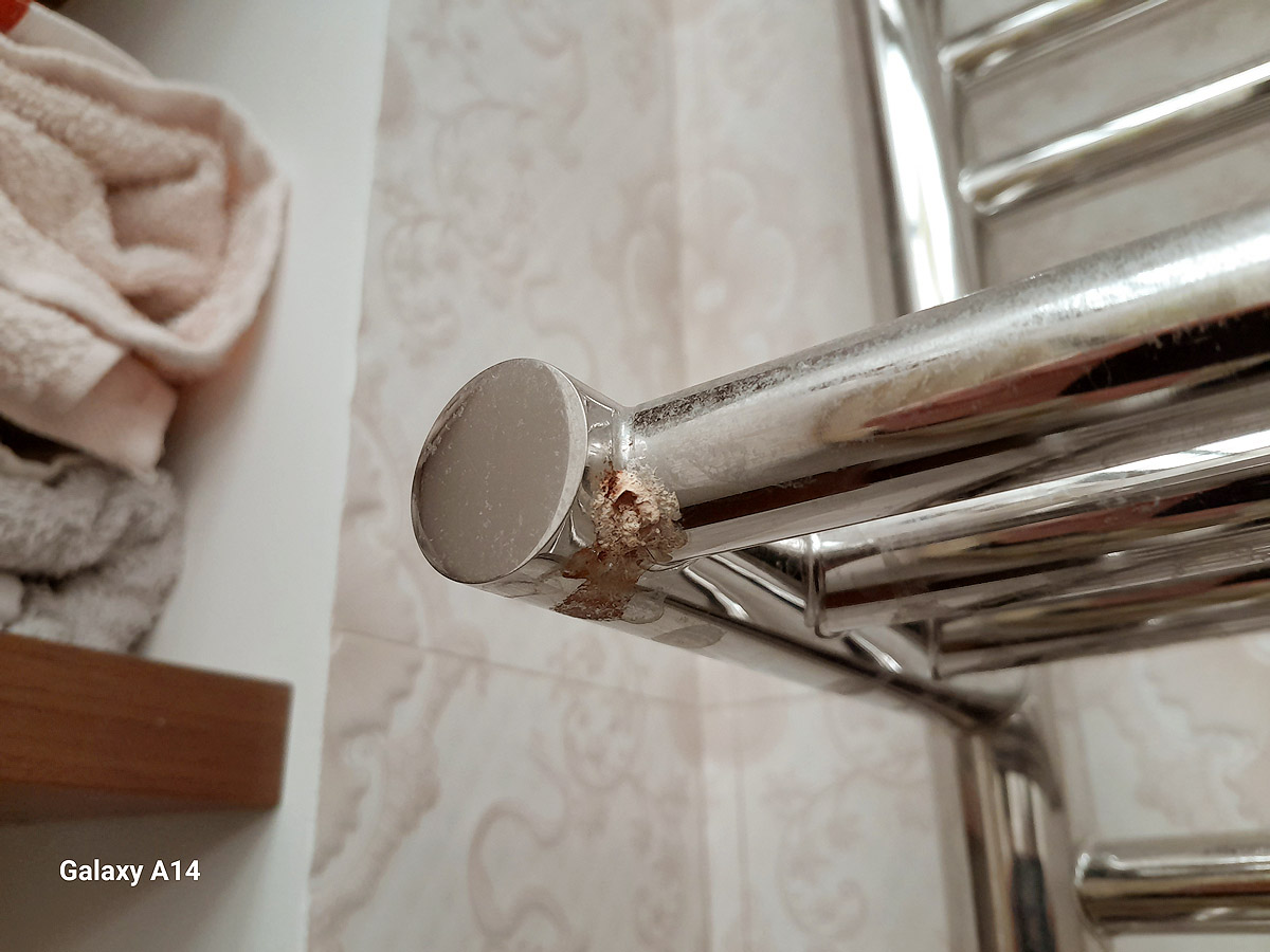 Не прошло и полугода как та-же самая проблема проявила себя снова. Каково же было мое удивление, когда на совершенно новой сушилке я увидел точно такие же очаги коррозии. Они возникли в других местах на полотенцесушителе, но точно такие же и тоже в местах сварки.