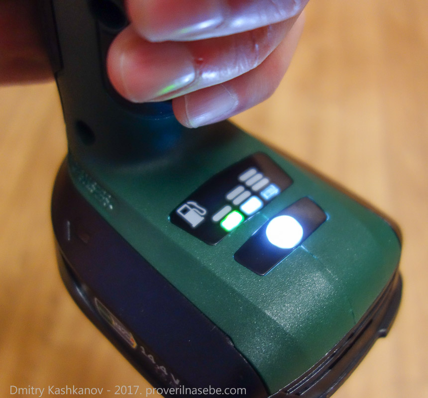 Теперь немного о световой индикации. На шуруповерте оказалось неожиданно много разных «огоньков». Первый вы уже видели на предыдущем снимке — световой индикатор зарядки батареи. Конечно это удобно — знать, сколько энергии осталось в аккумуляторе. Особенно это поможет после длительного простоя инструмента. Если надо поехать «помочь» кому-то с ремонтом, то приехать туда с пустыми аккумуляторами как-то не хотелось бы. У «заказчика» сразу возникнет вульгарная мысль о том, что вы просто не хотите помочь и нашли своей черствости отличное оправдание.