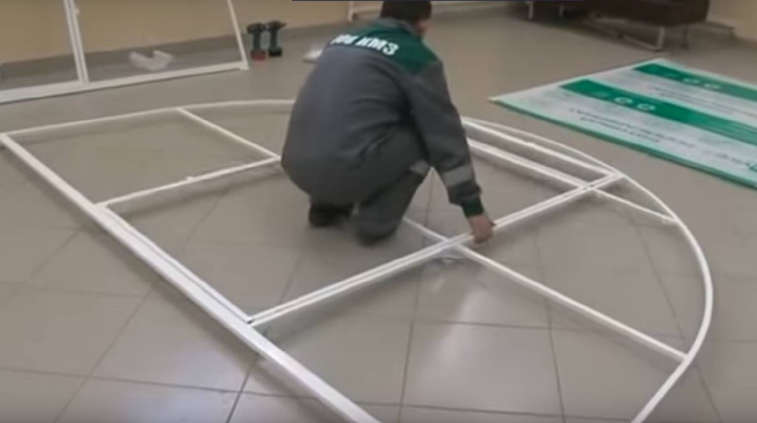 Следуя инструкции по сборке теплицы «Уралочка», на ровную поверхность укладывают основание так, чтобы выступы (штыри), предназначенные для соединения с другими элементами каркаса, были направлены вверх и внутрь теплицы. Далее производят следующие действия:
