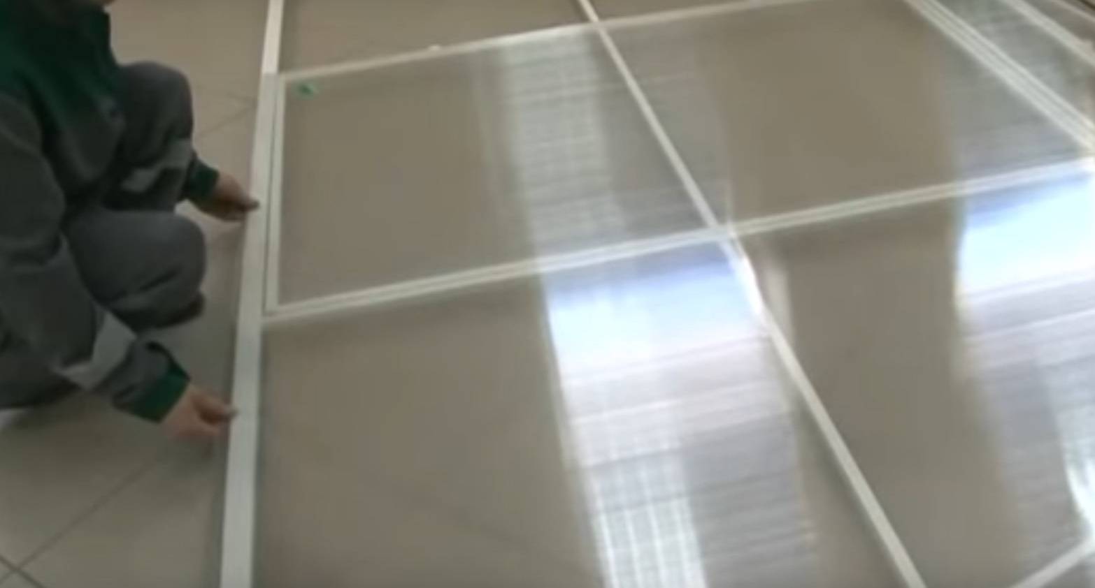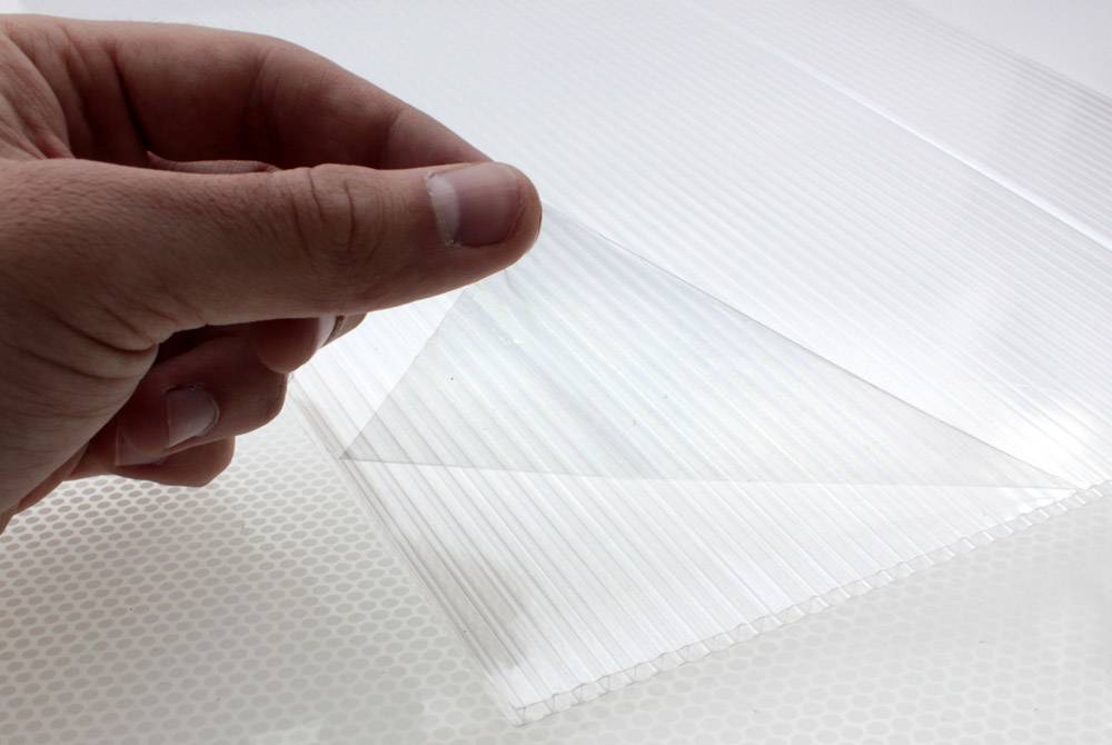 - На твердой и ровной поверхности расстилают лист сотового поликарбоната. Он поставляется в виде рулона и обклеен защитной пленкой с помеченной лицевой стороной. Снимают пленку непосредственно перед тем, как прикрепить покрытие к каркасу. Отрезают по линейке 2 листа длиной 2,02 м и 1 лист длиной 1,96 м.