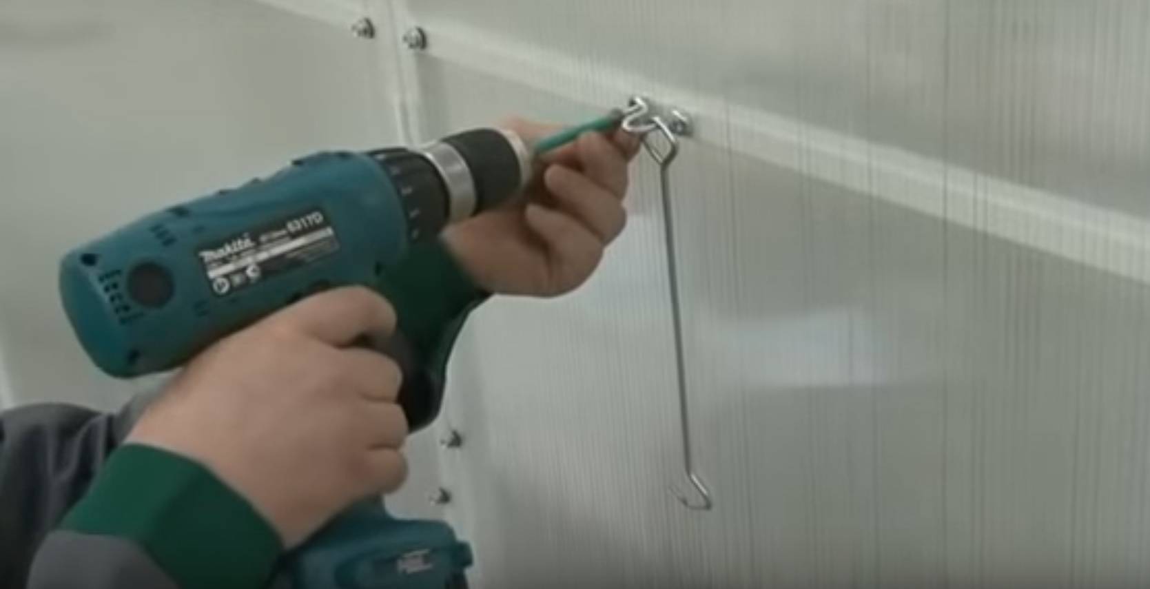- Поликарбонат закрепляют саморезами с помощью шуруповерта, в местах, которые производителем предусмотрены заранее – отверстия проделаны по периметру теплицы, дверей и форточки.