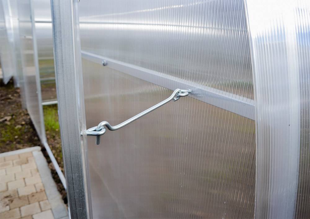 Производителем предусмотрено наличие двух торцевых дверей, что важно при выращивании овощных культур, требующих опыления соцветий. Кроме того, каркас оснащен форточками для регулирования микроклимата внутри пространства. Надежность фиксации поликарбонатного покрытия реализована посредством специальных оцинкованных стяжек