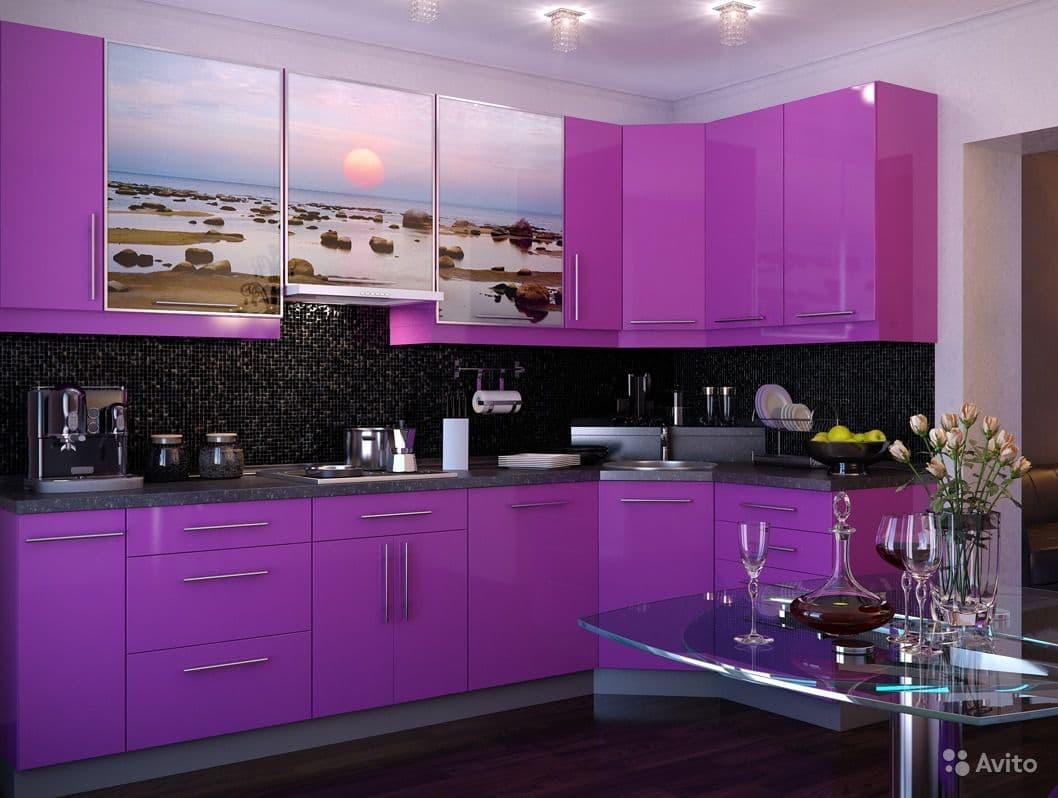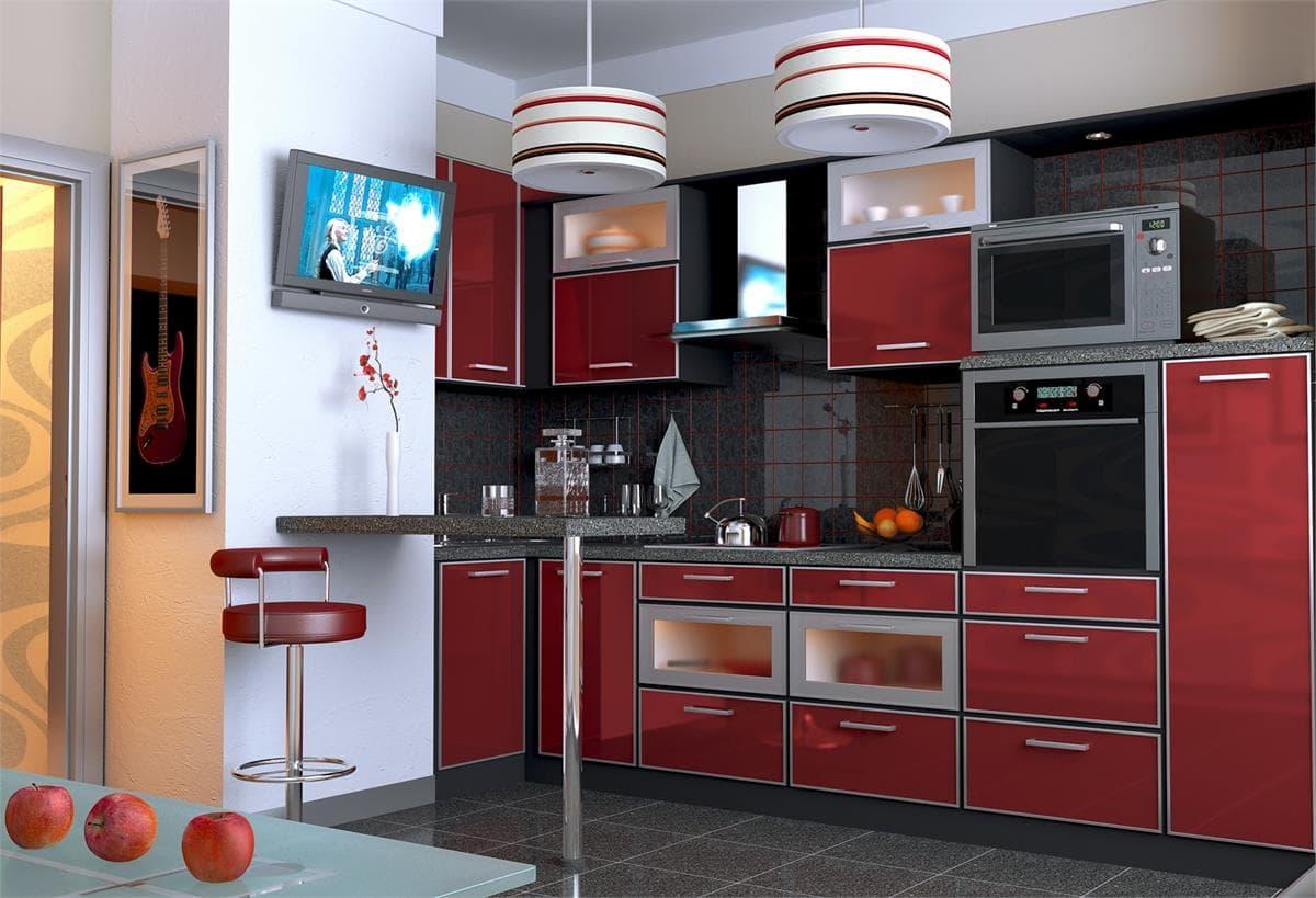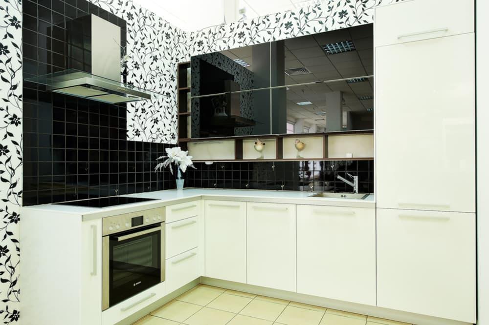 - Угловые. При таком способе расположения элементы гарнитура размещаются у двух смежных стен. Такой вариант также удобен для помещений небольшой площади. Дополнением к угловой кухне может служить обеденная группа. Нередко также размещается барная стойка.