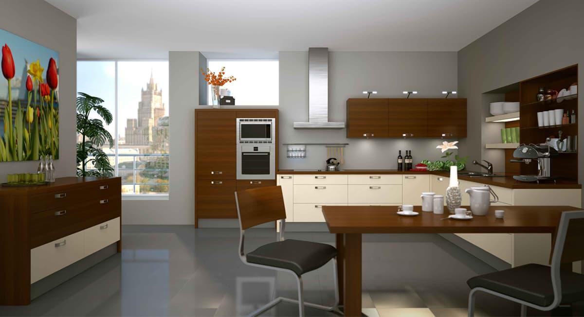 - U-образные. Как следует из названия, в данном варианте элементы размещаются около трех стен. Несложно догадаться, что данный вариант подходит только для просторных помещений. Неоспоримым преимуществом данного варианта, по отзывам пользователей, является возможность разместить большое количество кухонной техники, в том числе той, которую требуется убирать. Такие гарнитуры обязательно изготавливаются на заказ, чтобы точно соответствовать габаритам помещения.
