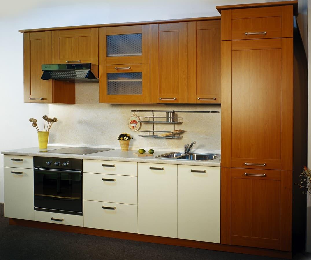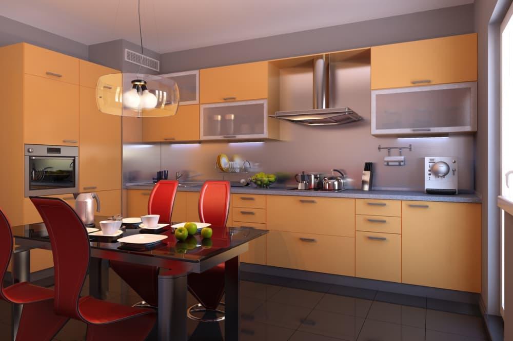 - Однорядные кухни. Это самый простой вариант расположения гарнитура. В этом случае все предметы мебели располагаются только вдоль одной стены. Для помещений малой площади это часто единственный вариант, позволяющий освободить пространство. Общая длина таких кухонь составляет, как правило, около 3 метров.