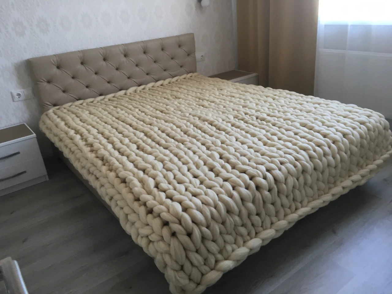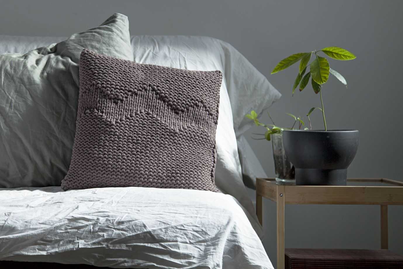 Крупная вязка лучше сочетается с однотонным постельным бельем