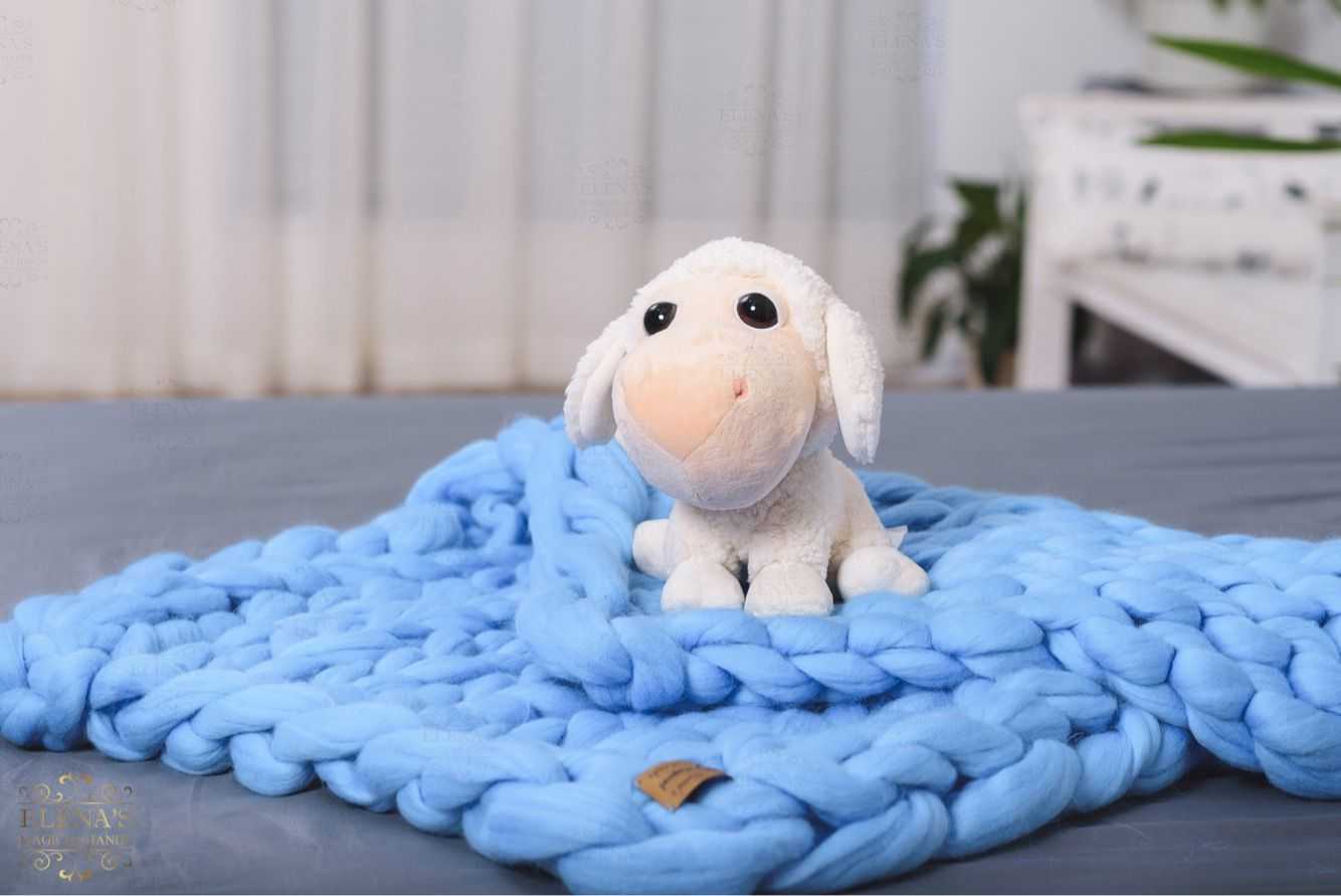 Плед крупной вязки отлично заменит одеяло для малыша: он легкий, объемный, не жаркий. Плед можно вдевать в обычный пододеяльник или использовать в качестве дополнения к одеялу в прохладные ночи. Днем пледом можно покрыть детскую постель: в отличие от тканевого покрывала он не мнется, если ребенок будет играть на заправленной кровати.