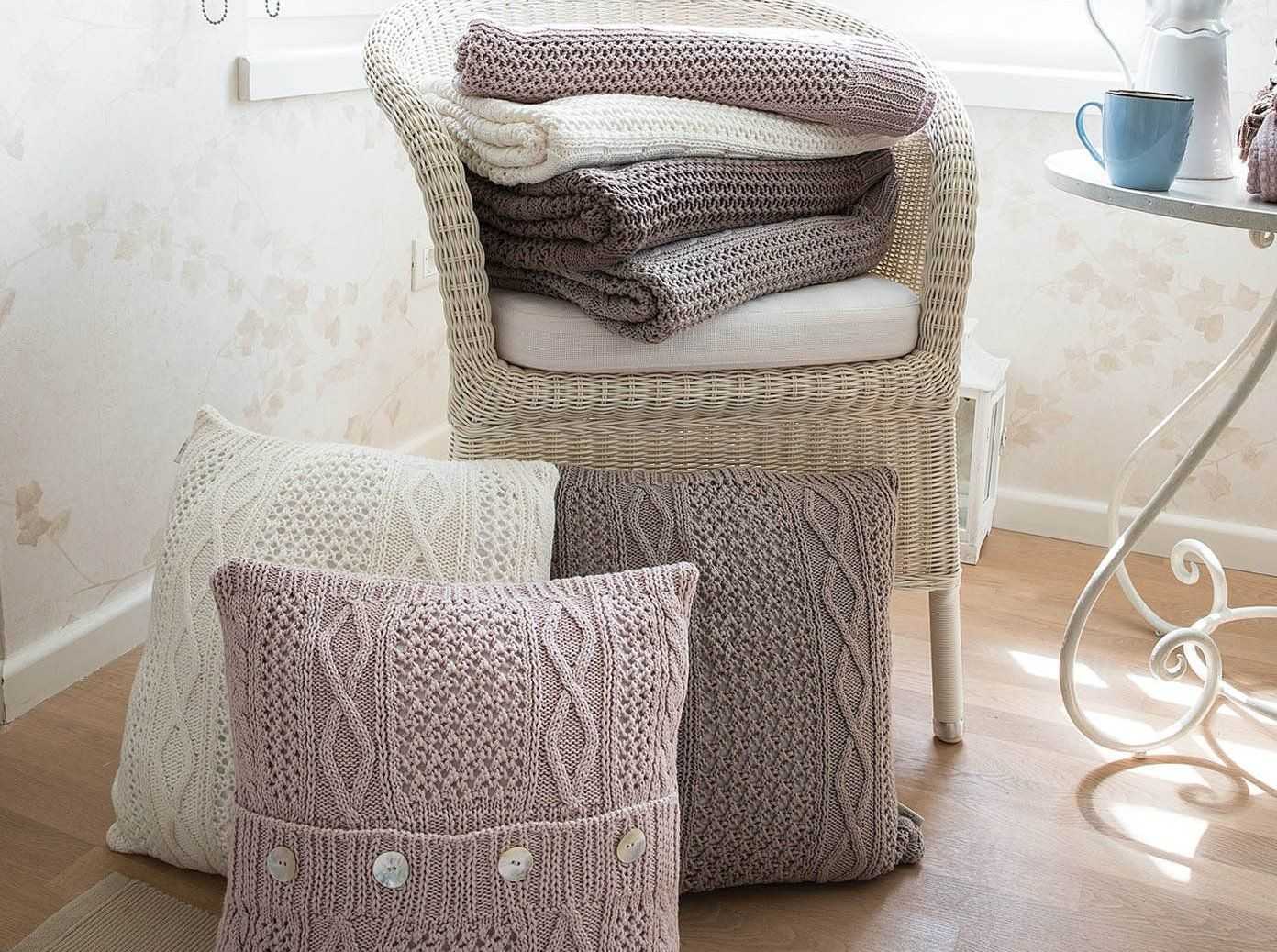 Крупная вязка пледов хорошо сочетается с гладкой обивкой мягкой мебели, однотонными коврами, натуральным овечьим мехом или его имитацией. Плед стоит дополнить уютными подушками, которые укладывают на диваны, кресла или прямо на пол.