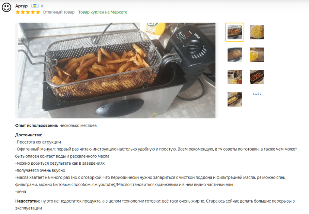 Корзина вмещает 5-6 порций картошки фри — почти как в профессиональных моделях фритюрниц. Температура плавно регулируется. Индикатор подскажет, что масло достаточно горячее и можно начинать готовить. Плотная крышка исключает брызги масла на кафеле. Есть фильтр — запах не пропитает всю кухню . Руководство по эксплуатации довольно подробное — можно узнать много полезных советов чтобы приготовить еду как в кафе.