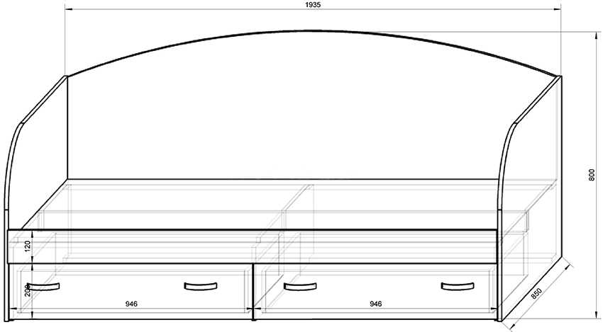 В состав каркаса конструкции для ребенка входят основание и спинки, что наглядно показано на чертеже кровати. Ширина и длина изделия определяется габаритами матраса. Нижняя часть кровати должна находиться на расстоянии от пола не более 35 см, что позволит ребенку без усилий забираться на нее.