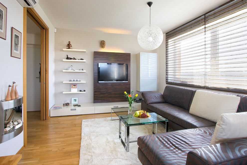 Возвращаясь к вопросу о мебельных стенках, можем смело сказать: их главная проблема заключалась в том, что все предметы интерьера располагались на одной стене. Это визуально уменьшало пространство. Современные дизайнеры решаются на некоторые хитрости, чтобы убить сразу нескольких зайцев: удачно расположить телевизор, оставить комнату просторной и светлой, обеспечить достаточное количество систем хранения. Например, они размещают возле противоположной стены от дивана комод, ставят на него ТВ, а справа устанавливают два книжных шкафа, можно из ИКЕА. Такой прием с разделением группы мебели по разным стенам позволяет добиться нужного эффекта.