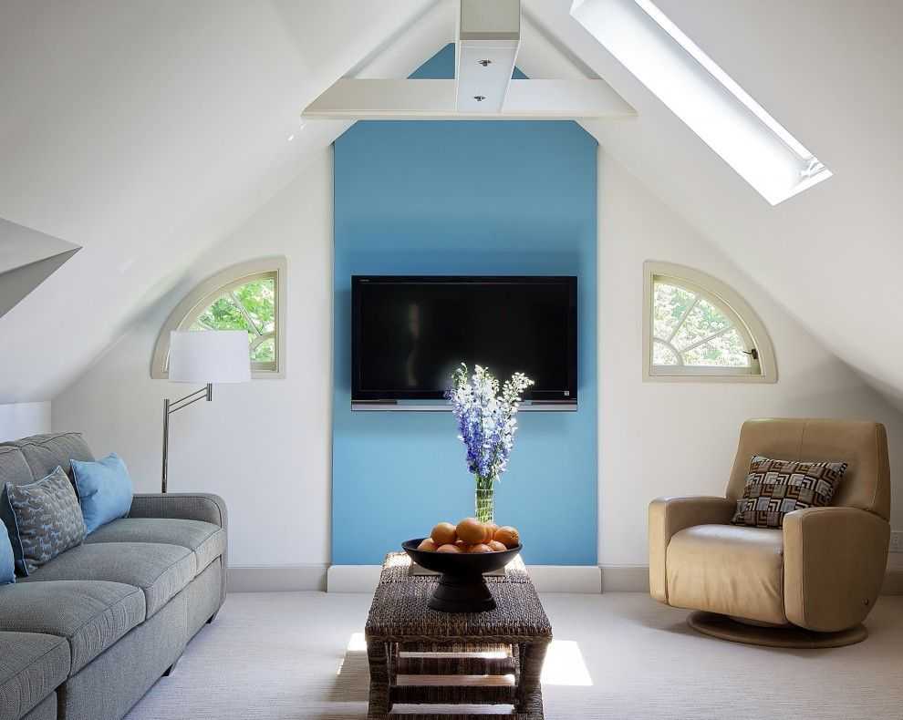если гостиная выполнена в светлых оттенках, в такой комнате современная плазма будет выглядеть большим черным пятном. Нивелировать дисбаланс можно с помощью акцентной стены, на которой закреплен телевизор. С этой целью используют контрастные цвета, в сравнении с основными светлыми тонами интерьера. Если гостиная выдержана в единой гамме, стену выделяют цветом на три тона темнее основного;