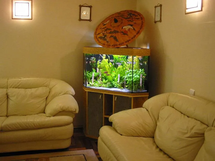 Угловой аквариум привносит в интерьер жизни и динамикиИсточник static.wixstatic.com