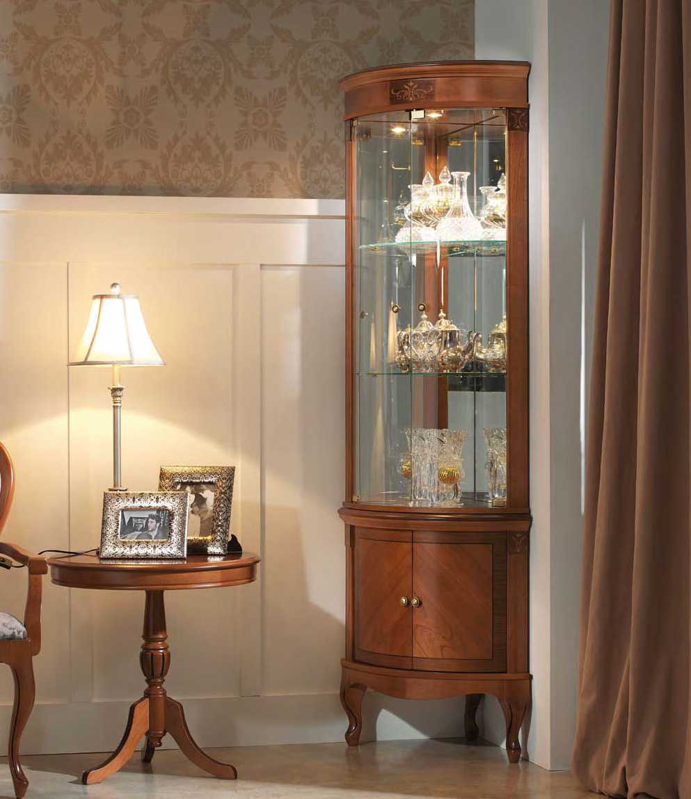 - угловой – модель особой формы, которая позволяет установить ее в угол помещения. Шкаф-витрина для посуды такого рода обязательно является самостоятельным элементом. Если сервант с обеих сторон будет загораживать другая мебель, фарфор и хрусталь продемонстрировать не удастся;
