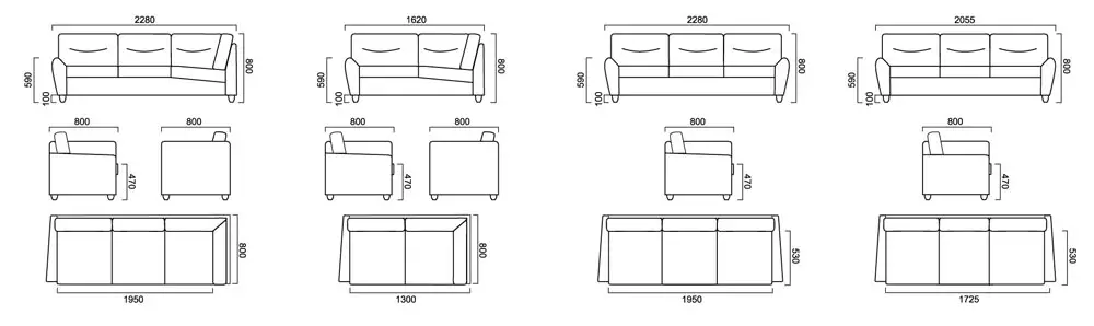 В сети можно найти большое количество чертежей диванов — от самых простых, до угловых и подковообразных. При выборе модели следует учитывать параметры места, где будет установлен диван, так чтобы его спинка не упиралась в подоконник, а боковины вписывались в пространство между остальной мебелью. Стандартные размеры большинства моделей заводского производства такие: