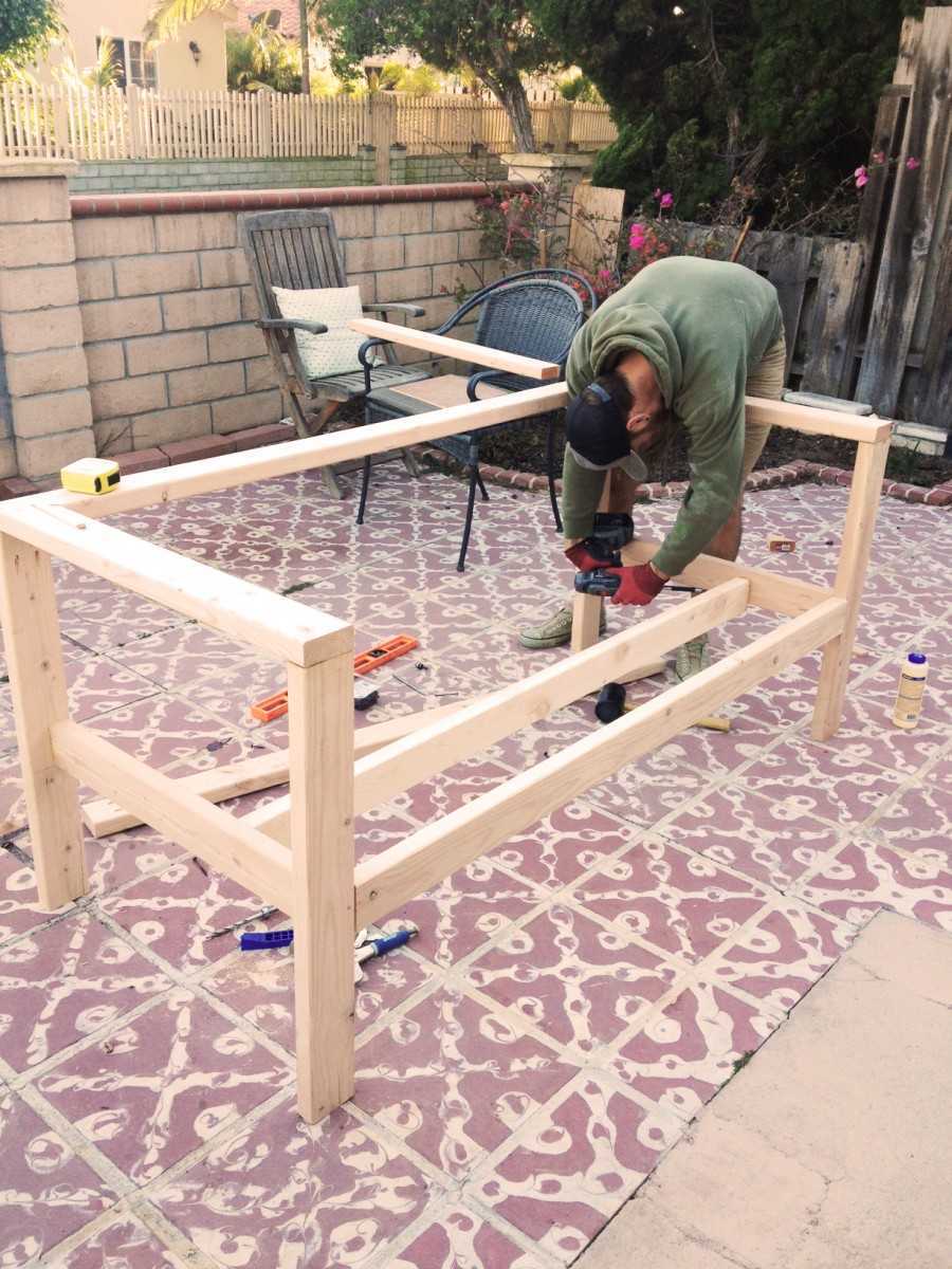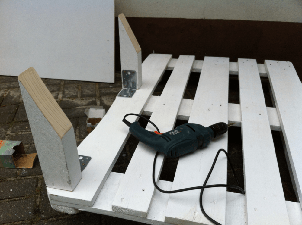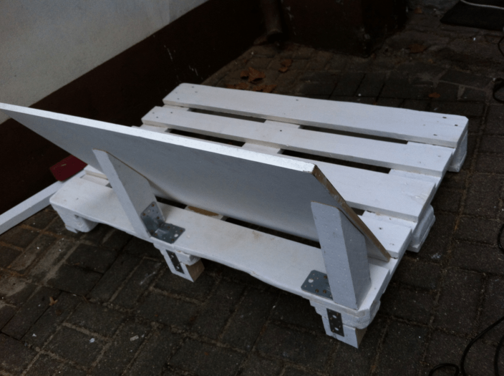 - К одной из частей под прямым углом прикрепляют несколько досок (для спинки). Они должны быть обработаны наждачной бумагой. Вверху детали спинки соединяются несколькими рядами досок.
