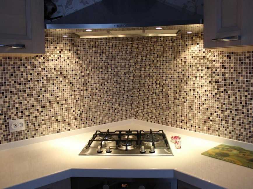 - • Одним из самых лучших и красочных вариантов является фартук для кухни из мозаики или фартук из живого камня. Он прослужит долгие годы и будет прекрасно украшать интерьер кухни. Однако большим минусом данного варианта будет высокая цена и проблемная установка.