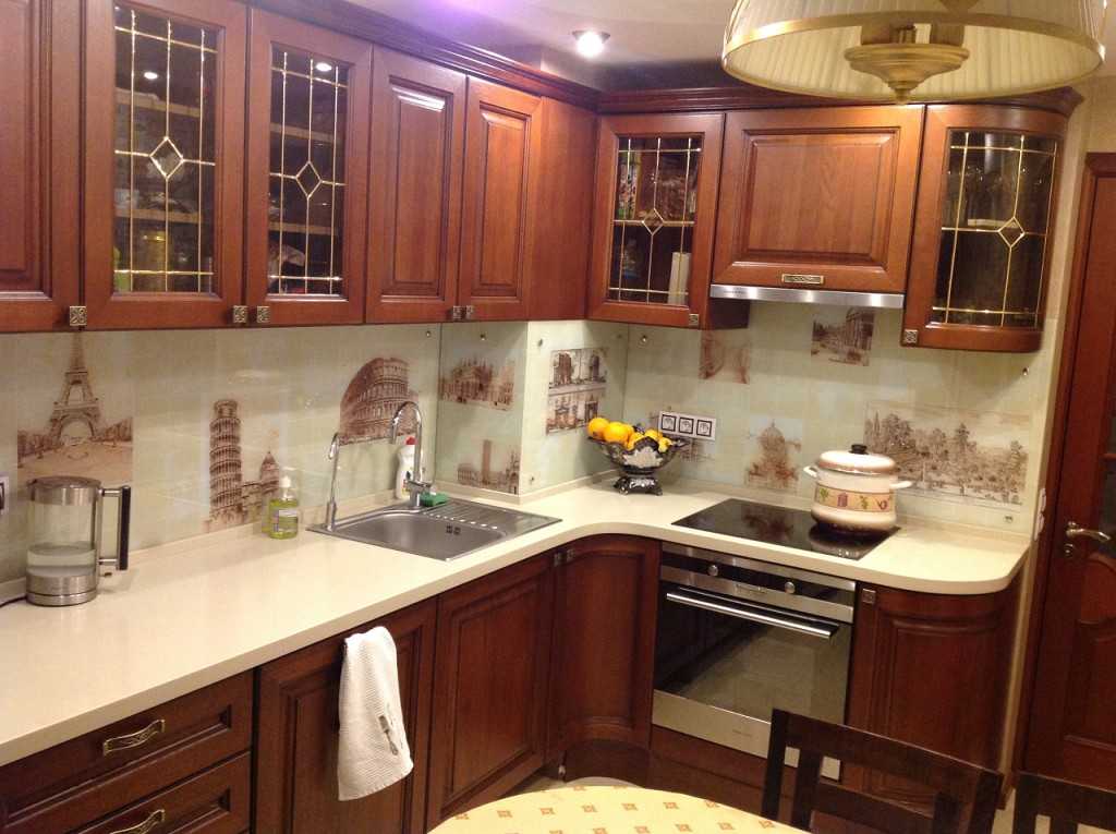 Фото Светлана 1975: «Мы всё делали сами, печать на пластике обошлась 3260 рублей (1100 метр квадратный — это уже с учетом пластика), стекло заказывали, обошлось в 3120 рублей (с учетом доставки стекловозкой — это 450 рублей в Калининский район, вырез под тройную розетку, 6 креплений на каждом стекле, еврокромка). Фартук из двух кусков 240х60 и 177х60. Вырез под розетку, мне кажется, даже дешевле, чем 350 рублей».