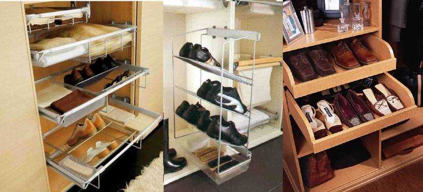 - Выдвижная обувница. Специализированная полка для обуви позволяет сэкономить немало места. Она выглядит как откидная (наклонная) полка или выдвижная сетчатая корзина; наиболее сложной с технической стороны является выкатная подставка.