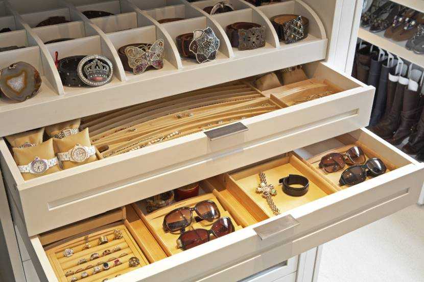 - Отделение для аксессуаров. Для аккуратного хранения ремней, часов, очков и других мелочей в шкафу планируют место для выдвижных ящиков особой конструкции. Ящик высотой 10-12 см разделяется на ячейки размером 10х10 см.