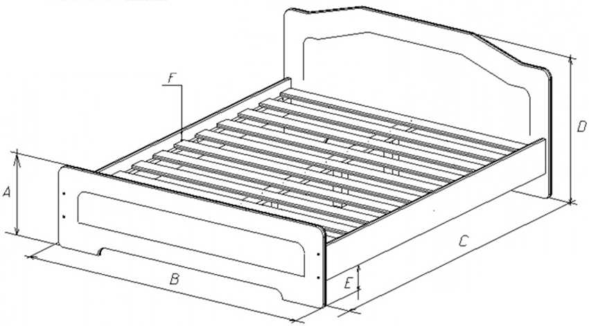 Чертеж двуспальной кровати, где А – 40 см, В – 147 см, С – 205 см, D – 82 см, E – 13,8 см, F – 5 см