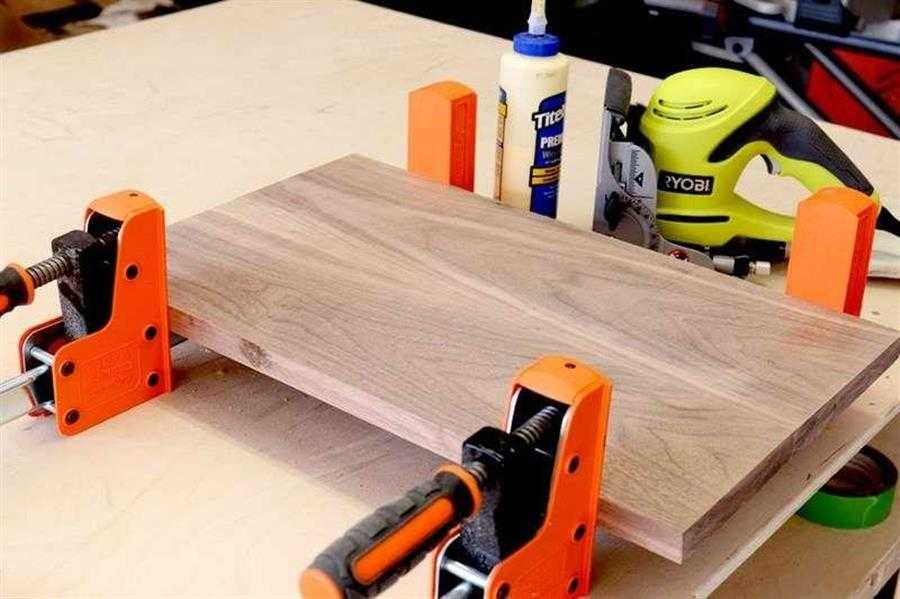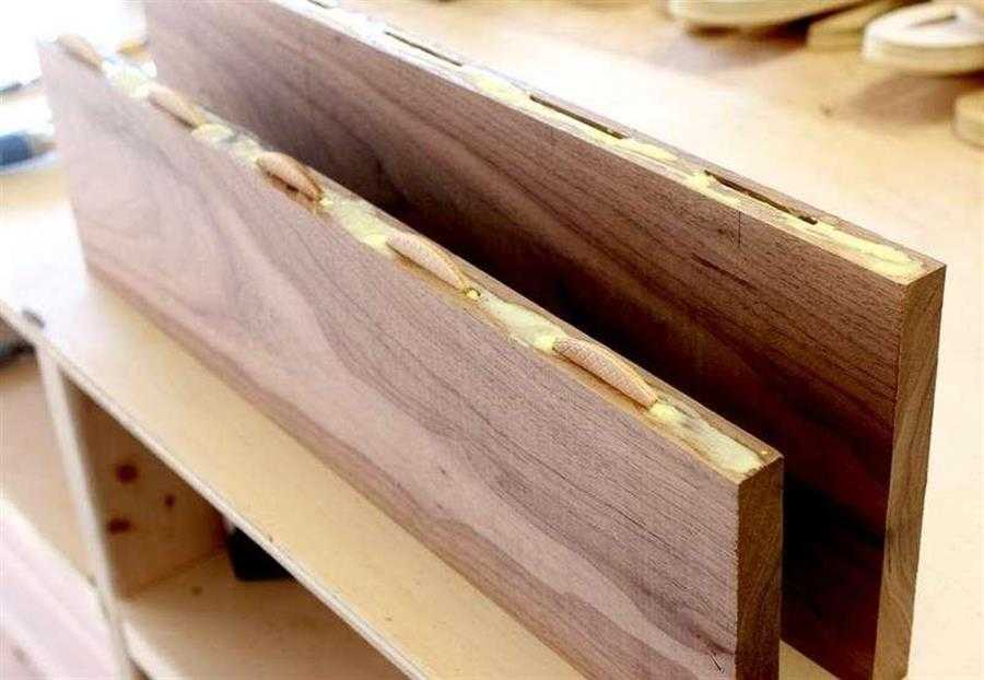 Начинаем со столешницы. Соединяем по технологии паз-шип две одинаковые доски, предварительно смазав их клеем