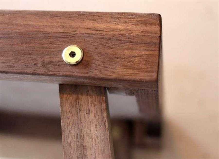 Столешницу нужно установить на опору и сильно прижать к ножкам. В куске бурса сделайте отверстие в 0,7 сантиметров, и присоединить эту деталь. Зафиксируйте опоры при помощи шайб.