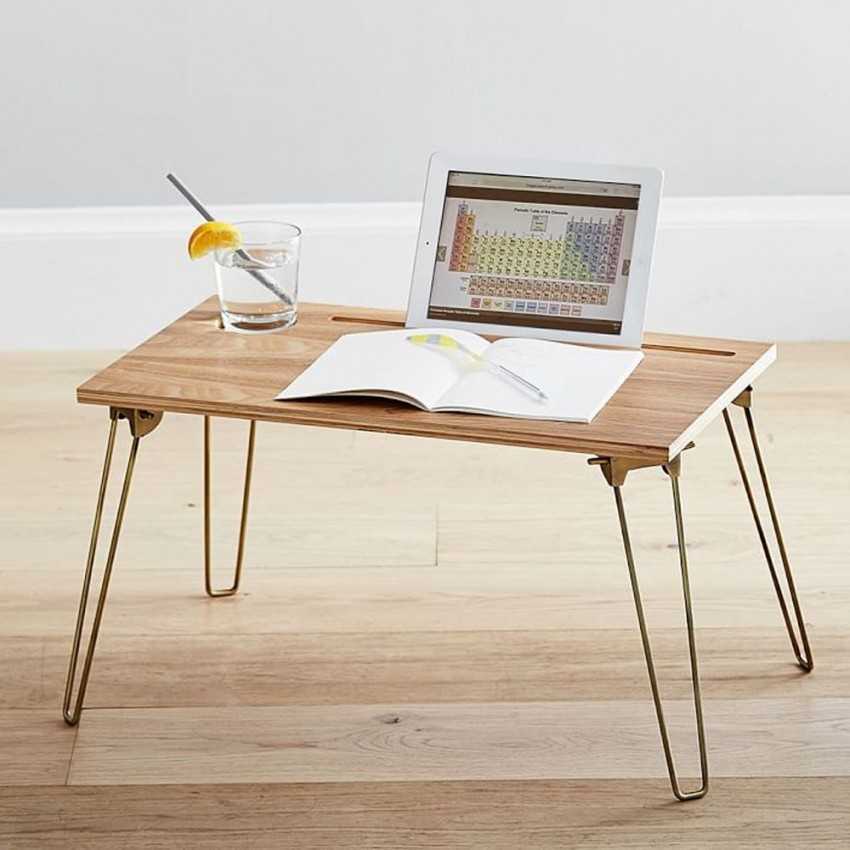 - Стол со складывающимися ножками. Такая модель похожа на первую, но она более удобна. Складной стол подходит для тех, кто любит пользоваться ноутбуком в постели или сидя по-турецки. Для его изготовления понадобятся столешница и 4 стандартных ножки или 2 широкие опоры, которые присоединяются к столу при помощи шурупов и гаек (или рояльных петель). Вариантом этой модели являются стол с вырезом для кружки. Такое изделие позволяет не только удобно работать за ноутбуком, но и пить при этом свой любимый напиток.