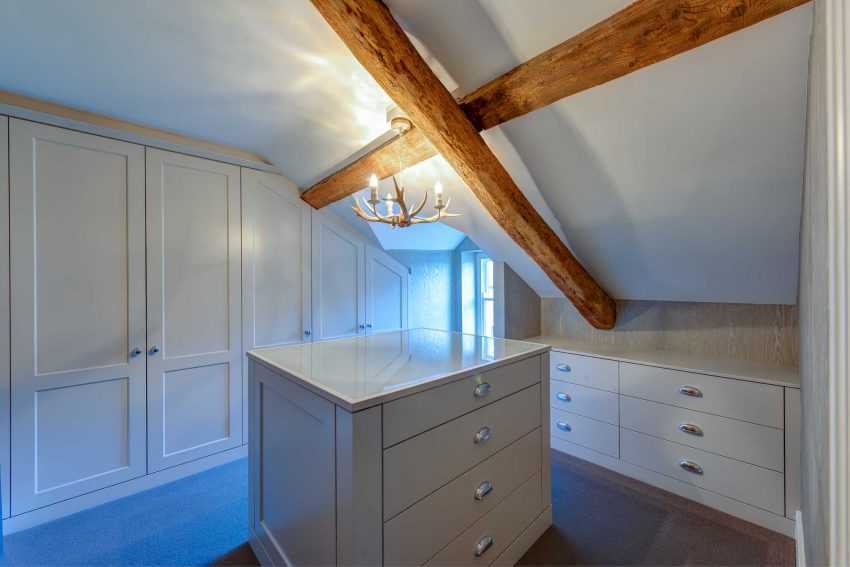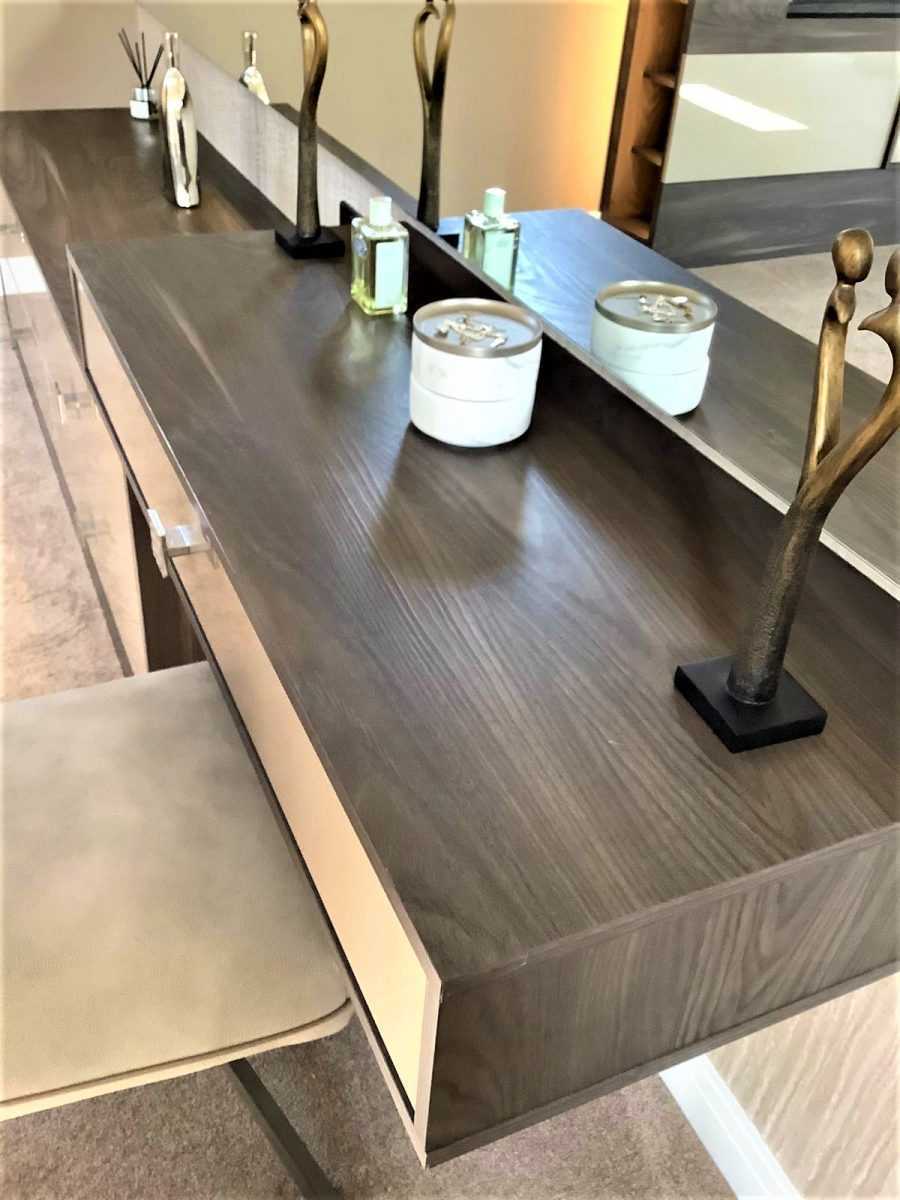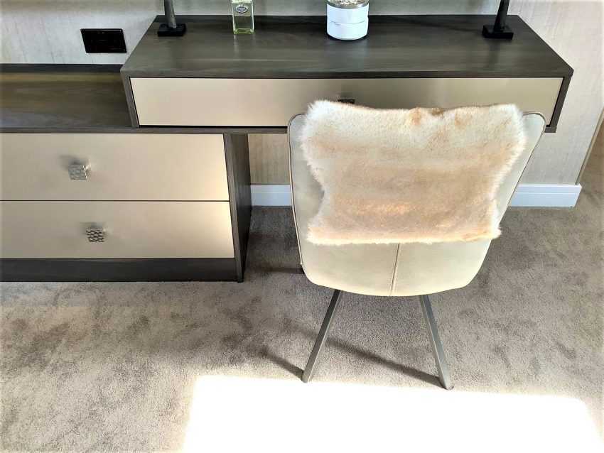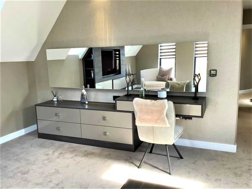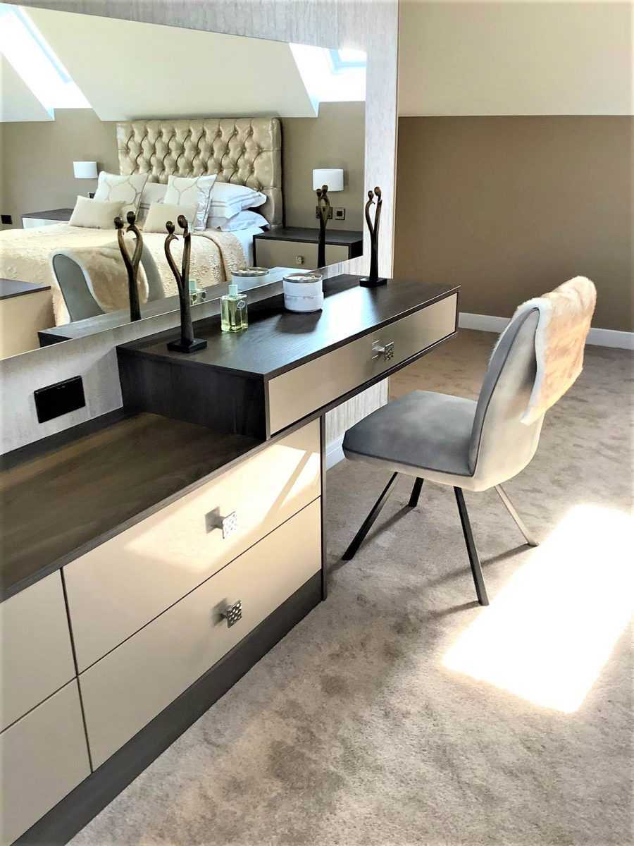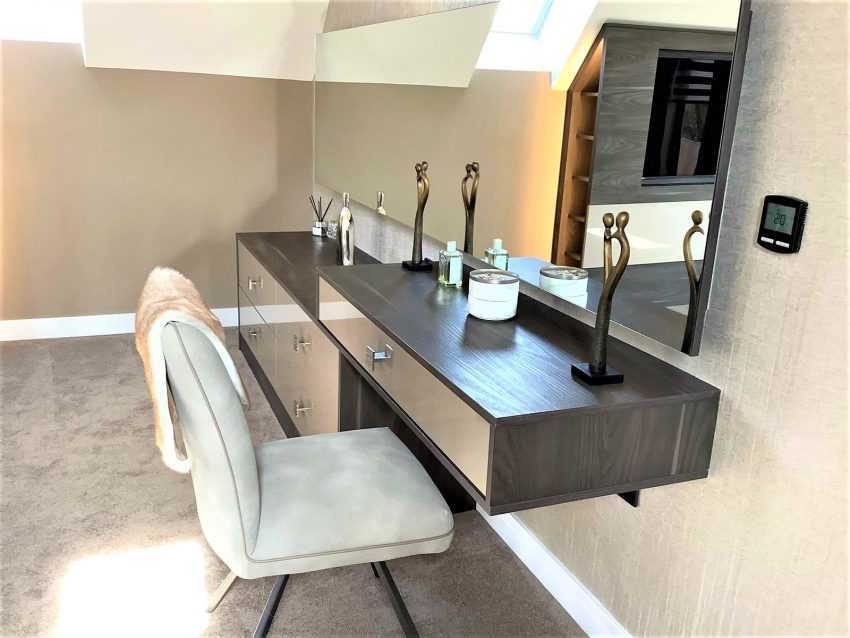 2. Если будет стоять туалетный столик, то от его переднего края до другого предмета мебели должно быть не менее 70 см. Это при условии, что этот промежуток не будет проходным. Ровно столько нужно, чтобы с комфортом пользоваться столиком, сидя на стуле, кресле или пуфе. Если в этом месте будет проход к окну или кровати, нужно оставить больше пространства — от 1 метра.