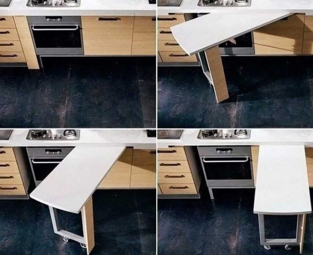 Маленькая кухня вовсе не повод отказываться от барной стойки. Отличным вариантом будет установка откидной столешницы. Достаточно опустить столешницу, чтобы получить полноценное рабочее место и поднять ее, когда необходимость в использовании отпала. Благодаря такой конструкции, можно эффективно использовать площадь кухни, не занимая при этом лишней площади. Кроме того, для изготовления не требуется существенных затрат.